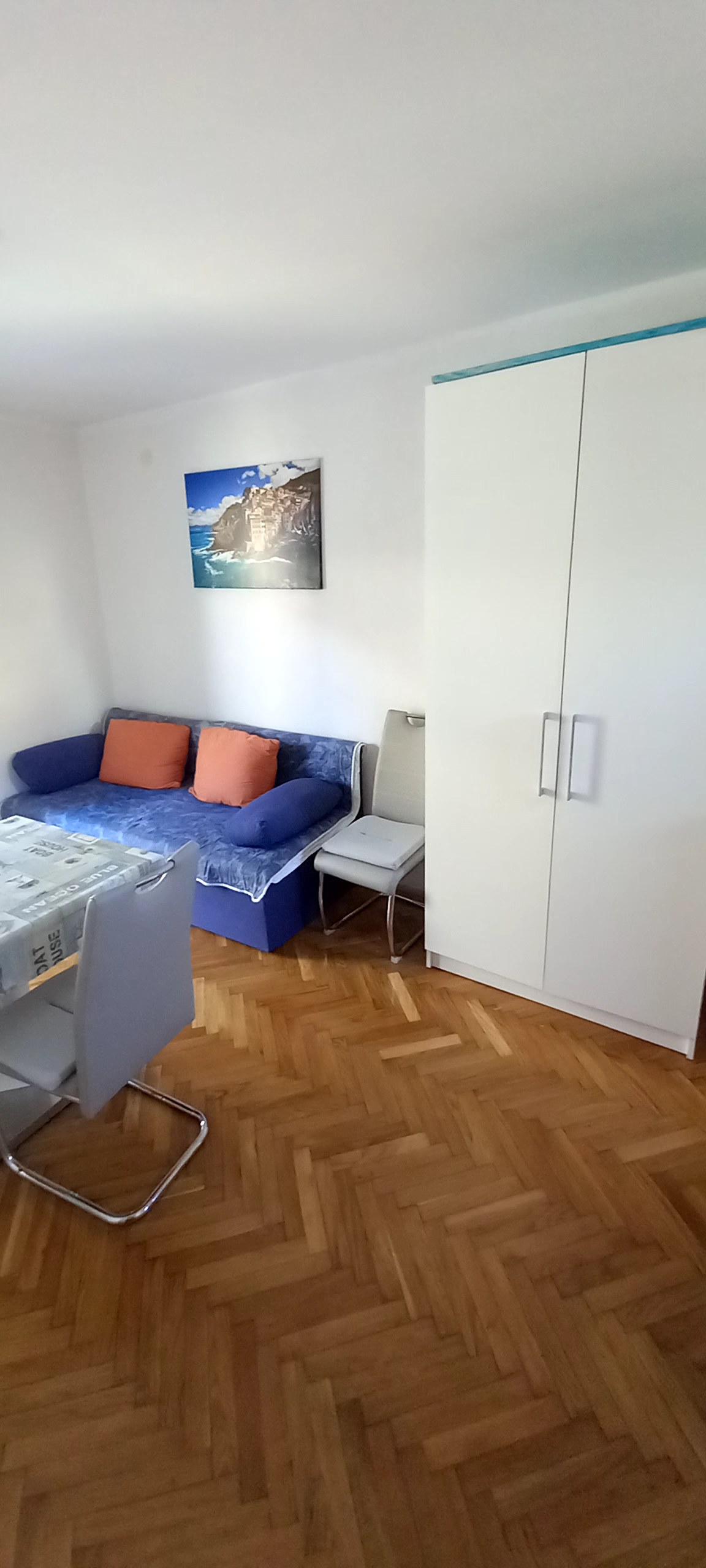 Ovaj klimatizovani studio apartman se nalazi na jugu na 1. spratu kuće i ima sve što vam treba za prijatan i bezbrižan boravak. Sastoji se od male, ali potpuno opremljene kuhinje, trpezarijskog stola za dvoje, kupatila, kreveta (160x200) i privatnog balkona sa pogledom na more. Pogodno za kućne ljubimce, sa obavezno najavom.