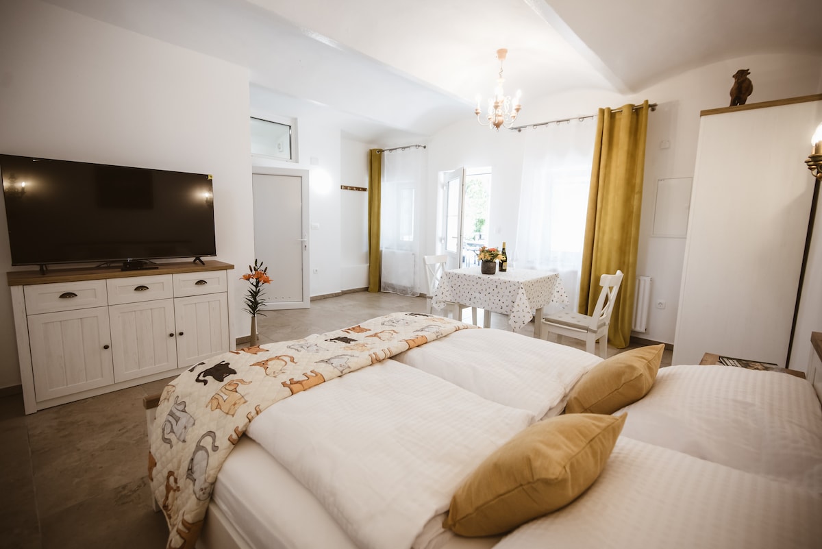 🌻Dobro došli u naš udoban „glamping” apartman. 🐛 Nalazi se u seoskoj kući okruženoj zelenilom. Divlja bašta, sa svojim raznovrsnim cvijećem, povrtnjacima i visećom ležaljkom, nudi savršeno mjesto za opuštanje. Voćnjak s kamerunskim ovcama dodatno poboljšava vašu priliku da provedete vrijeme neometano u prirodi. Termalna kupališta su odmah iza ugla, a dva jezera za kupanje su nadohvat ruke. Vredi posetiti i fabriku čokolade Zoter i zamak Rigersburg!