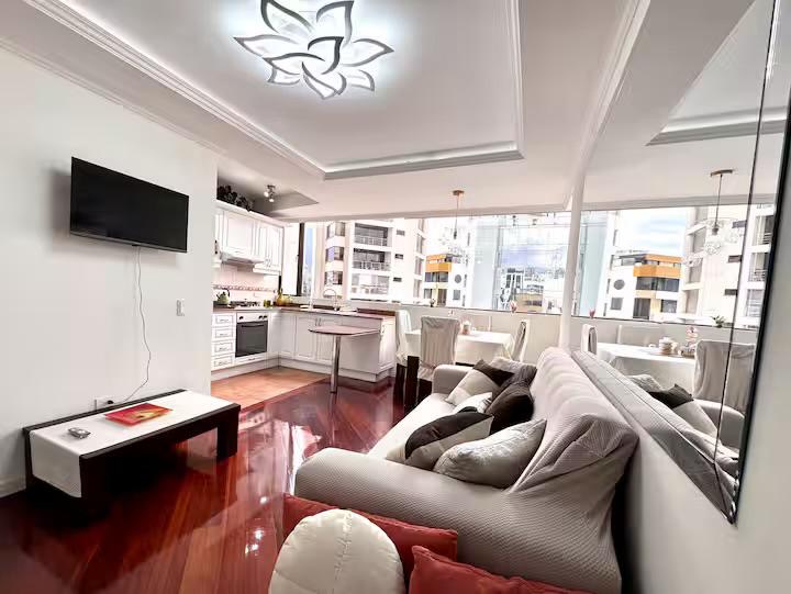 We are located 3 blocks from La Carolina Park and the same distance from Metropolitan Park. From the airport, the drive is 40 minutes. Downtown Quito is 5 km away (17 minutes), and the Middle of the World City is 26 km away (40 minutes). Free parking, 24-hour reception, and free Wi-Fi. In the apartment you will find: 2 bedrooms 2 bathrooms living room equipped kitchen, dining room, washer and dryer 2 flat-screen Smart TVs 24/7 security