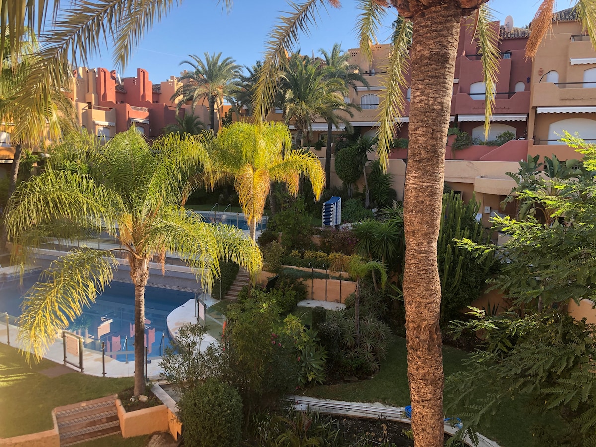 Vrlo lijep stan sa 2 spavaće sobe, dva kupatila, uključujući glavni apartman sa direktnim pristupom terasi za dvije spavaće sobe Uredna dekoracija sa svom udobnošću Internet, francuski TV kanali Brižna porodica je zatražila ... Terasa opremljena sa 50 m2, sa sofom, ležaljkom, foteljom, suncobranima. U rezidenciji sa bazenom, ležaljkama i suncobranima. Mali bazen za djecu Rezidencija se nalazi na visini Marbele, u zlatnim miljama, u andaluzijskom stilu, nije zanemarena.