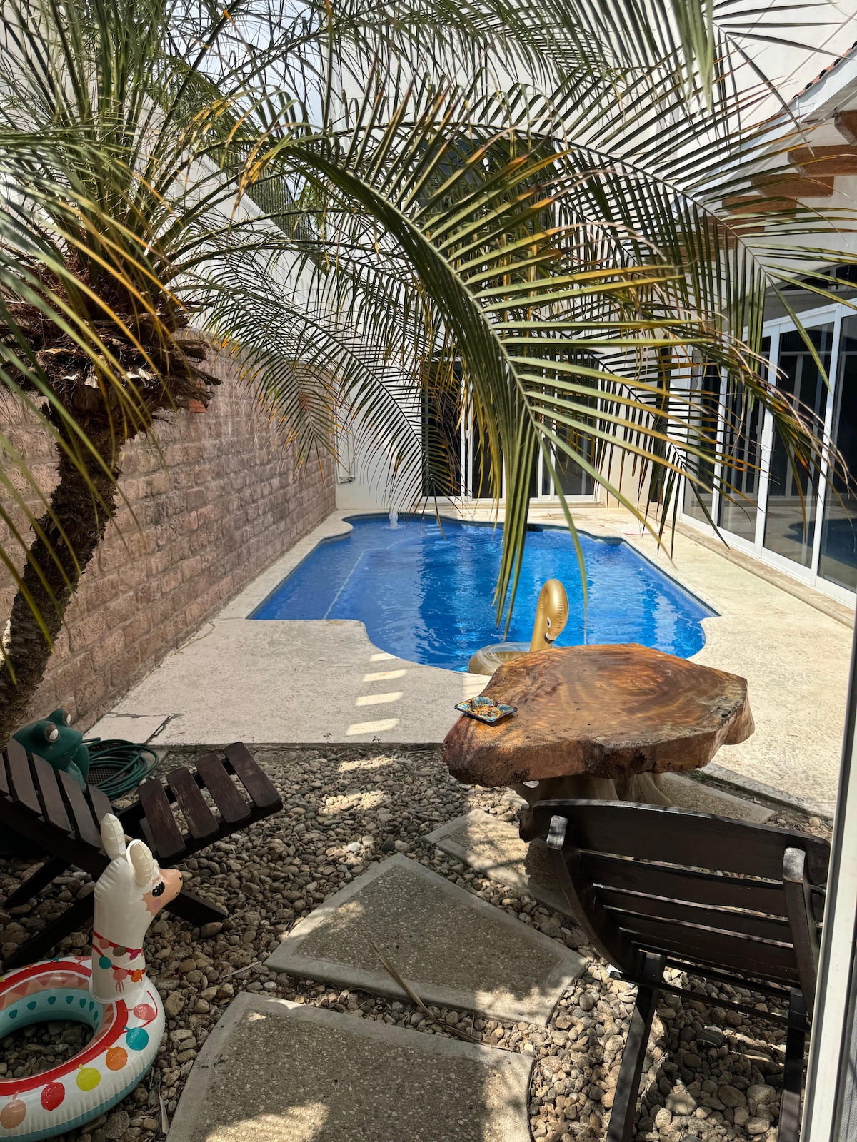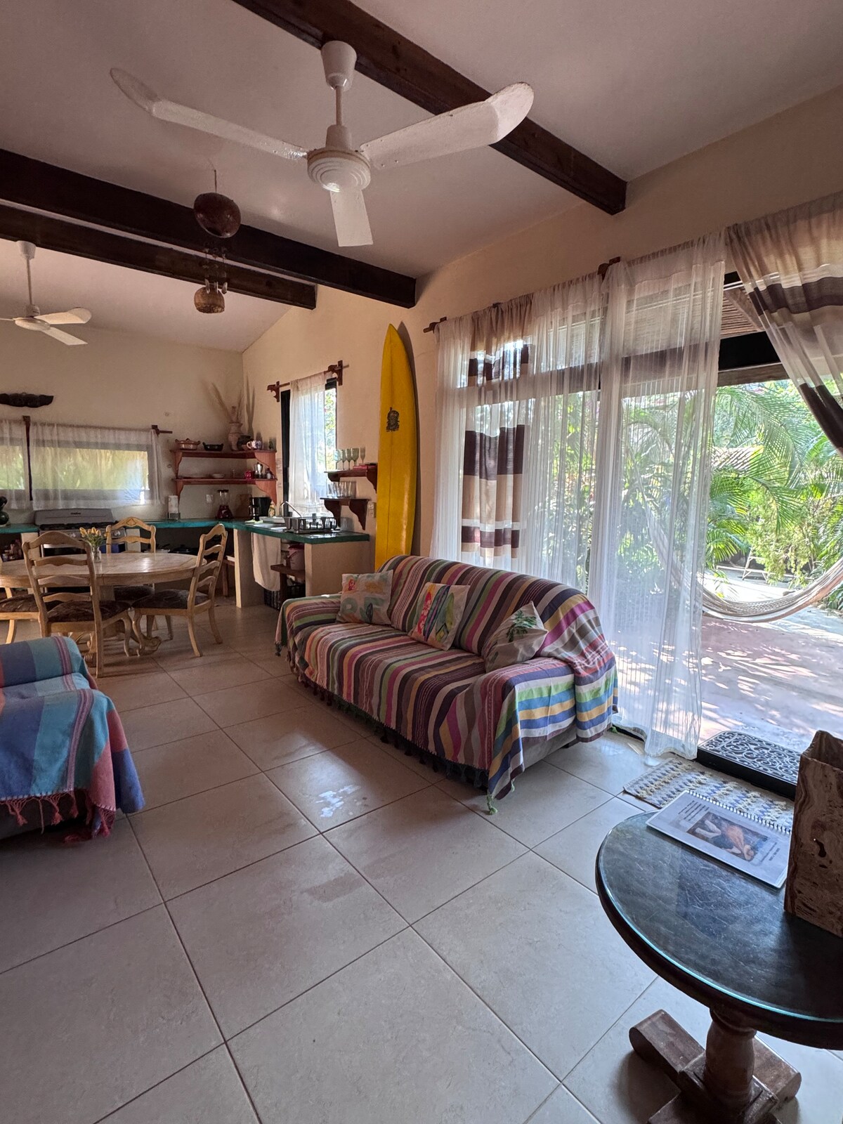 Depa amplio y luminoso en planta alta con 2 camas queen súper cómodas, A/C en la recámara y ventiladores en sala y cocina. Cuenta con cocina equipada, salita acogedora y balcón con vista a palmeras. Estás a solo 2 min de la playa y a 1 min de cafés, tiendas y restaurantes. Disfruta el patio compartido con hamacas, árboles frutales, asador y área de pesas artesanales. Ideal para relajarte, ver atardeceres increibles, surfear o trabajar remoto con buena vibra