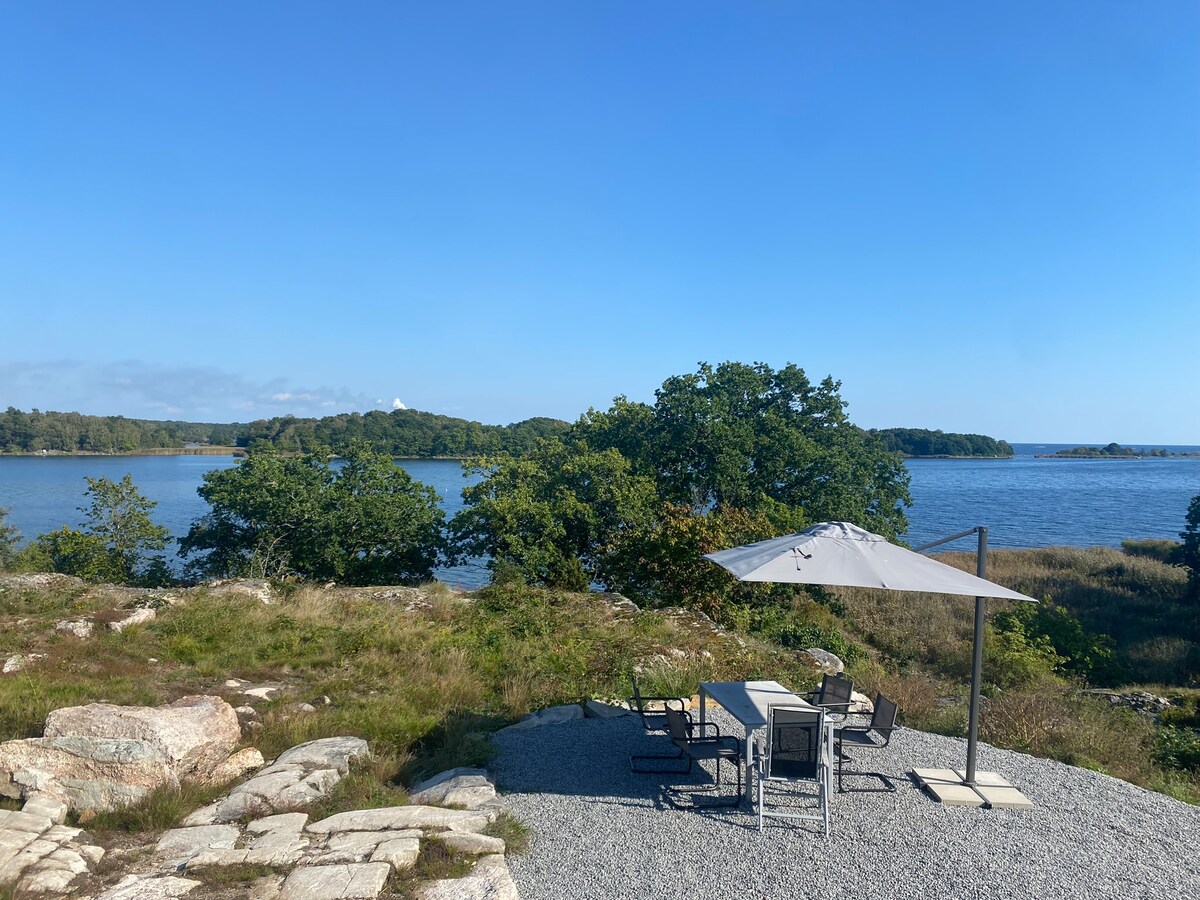 Moderna vila sa pogledom na more za porodicu pruža udoban smeštaj. Veliki prozori prema moru i velika bašta koja se sastoji od stena i trave, sa nekoliko mesta za sedenje i opuštanje. Uživajte u atmosferi i fantastičnom pogledu! Manja veranda ispred kuće nudi udobna i mirna mesta za odmor sa suncem tokom celog dana. Pratite kratku stazu do privatne manje plaže (pogodno za decu) - deli se sa drugom kućom. Dugo plitko more savršeno za decu i/ili SUP. Blizu Sweden Rock-a.
