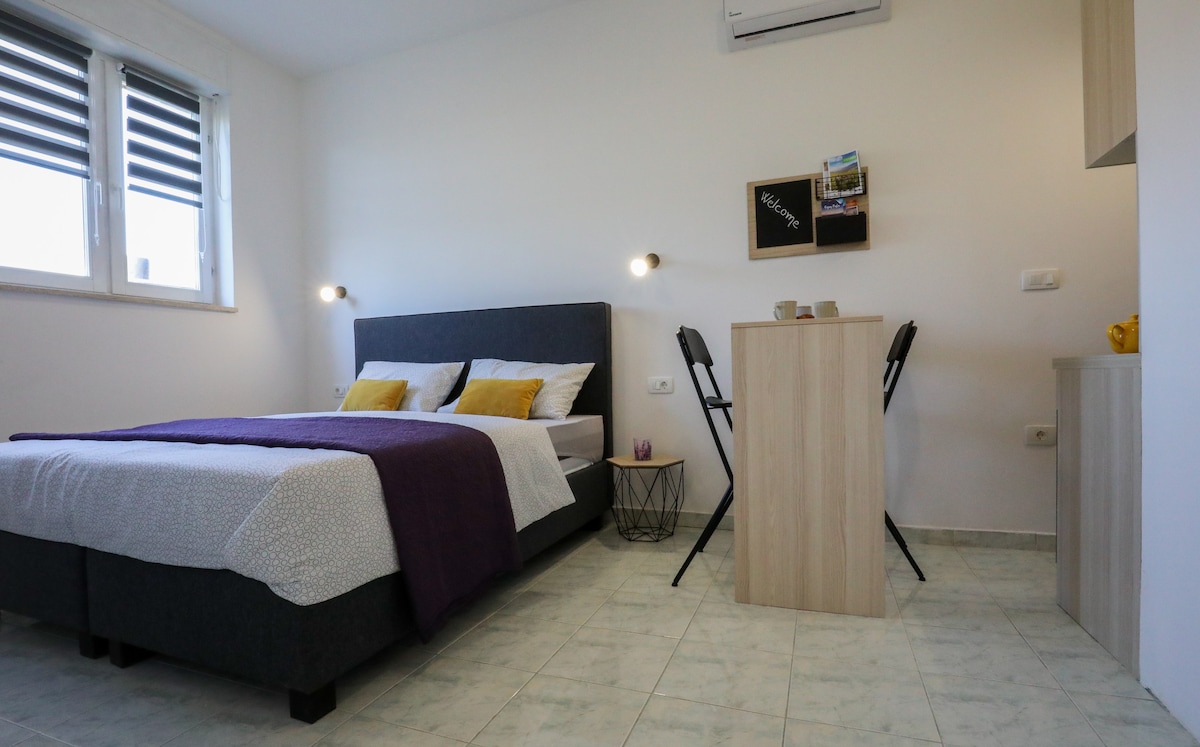 Dobrodošli u slatki i privatni studio apartman u mirnom delu Pule, udaljen 5-10 minuta hoda od samog centra grada. Lijepi i novouređeni studio apartman sastoji se od ulazne dvorane, kupaonice s tušem, kuhinje s barom i kreveta s oprugama. Ispred stana se nalazi sunčana terasa na kojoj možete da sedite, opustite se i uživate u suncu. Možete koristiti i garažu i parkirati auto u njoj. Apartman ima klimu, besplatan wi-fi, toster i aparat za kafu.