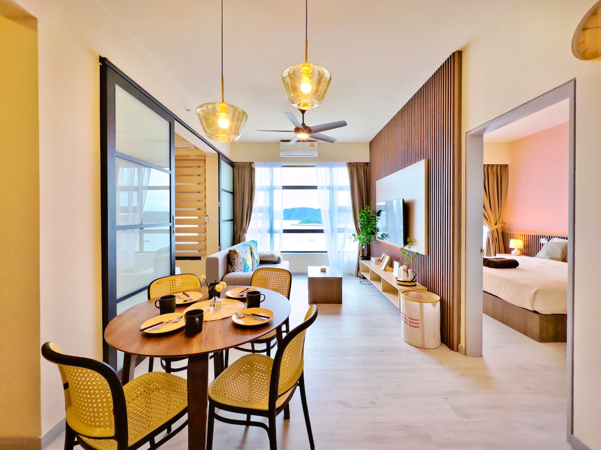 Prvobitno naš porodični dom, naš smeštaj je veoma prostran (158 kvadratnih metara) sa modernim i udobnim renoviranim enterijerom koji se sastoji od punog pogleda na more sa pogledom na Južnokinesko more. Ima pogled na zalazak sunca koji oduzima dah! Nalazimo se odmah iznad najprestižnijeg tržnog centra Imago, u srcu grada Kota Kinabalu, na samo 5–10 minuta od aerodroma. Imaćete pristup međunarodnom supermarketu i restoranima koji nude sve od lokalnih ukusa do kremastog sladoleda. Savršeno je za porodice koje putuju zajedno.
