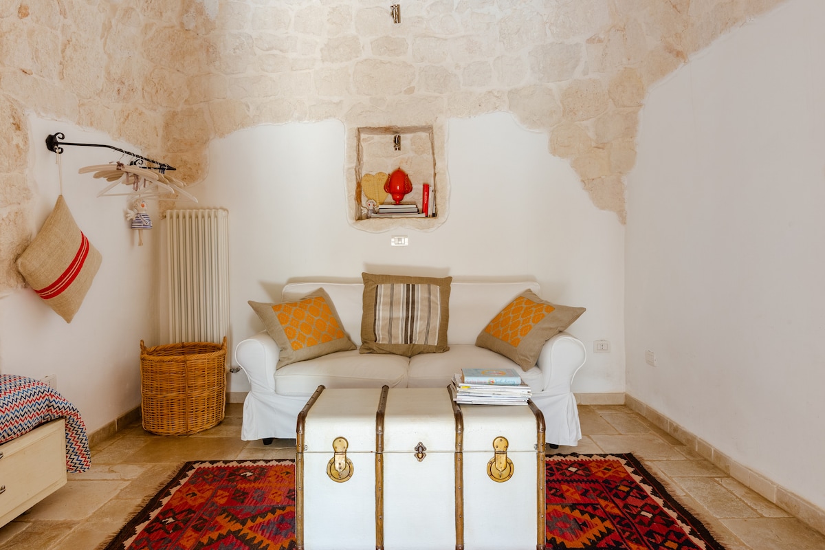 CIS: BR07401291000000188 NIN: IT074012B400033730 Doživite čaroban osjećaj boravka između prošlosti i sadašnjosti - to je istorijski dom! Starinski podovi i kameni zidovi su pozadina okruženja opremljenog dizajnerskim predmetima, starom keramikom i lokalnim namještajem. Velika privatna terasa, sa solarijumom i toplim tušem, će vas oduševiti: možete se opustiti uz čašu vina u sumrak, uživati na suncu na udobnim ležaljkama ili pripremiti večeru u čarobnoj apulijskoj atmosferi.