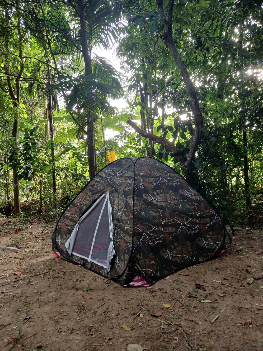 กระท่อมไม้ไผ่ใต้ร่มไผ่กับที่กางเต๊นท์เล็กๆในสวนหลังบ้าน พอมีที่พักให้พิงใจ =) ราคารวมอาหารเช้านะ A bamboo hut under the shade of bamboo trees, with a small tent space in the backyard garden — a cozy place to rest your heart =) Price includes breakfast.