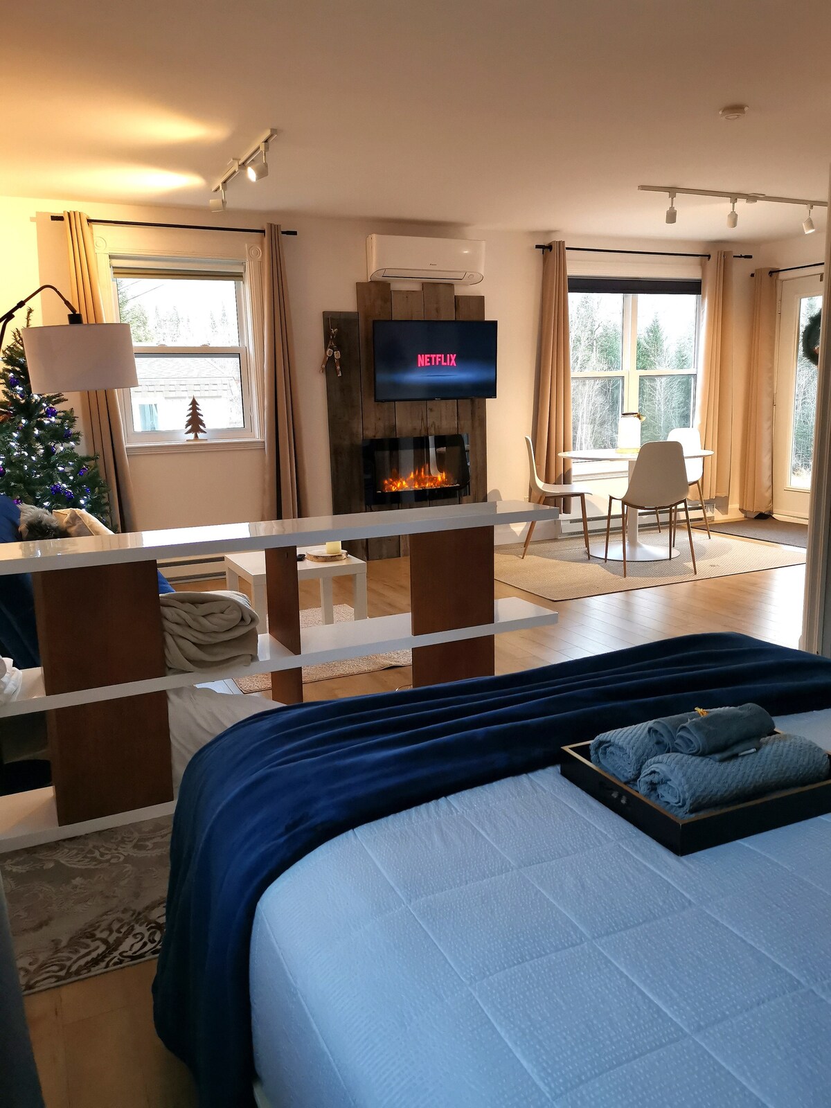 Prelijepa moderna garsonjera u Nordetu. 1 bračni krevet (širine 150-179 1 bračni krevet na izvlačenje 1 kauč Doručak nije uključen. Dozvoljeni su samo psi (2max, 15 $ po noćenju po psu) Spa centar na otvorenom po REZERVACIJI dostupan je uz doplatu. Potvrdite raspored na veb sajtu objekta Nordet. Pogled na more, Pointe St-Pierre i izlazak sunca Izuzetno brza Wi-Fi mreža Radni sto Ravni televizor Fen za kosu Potpuno opremljena kuhinja Peškiri