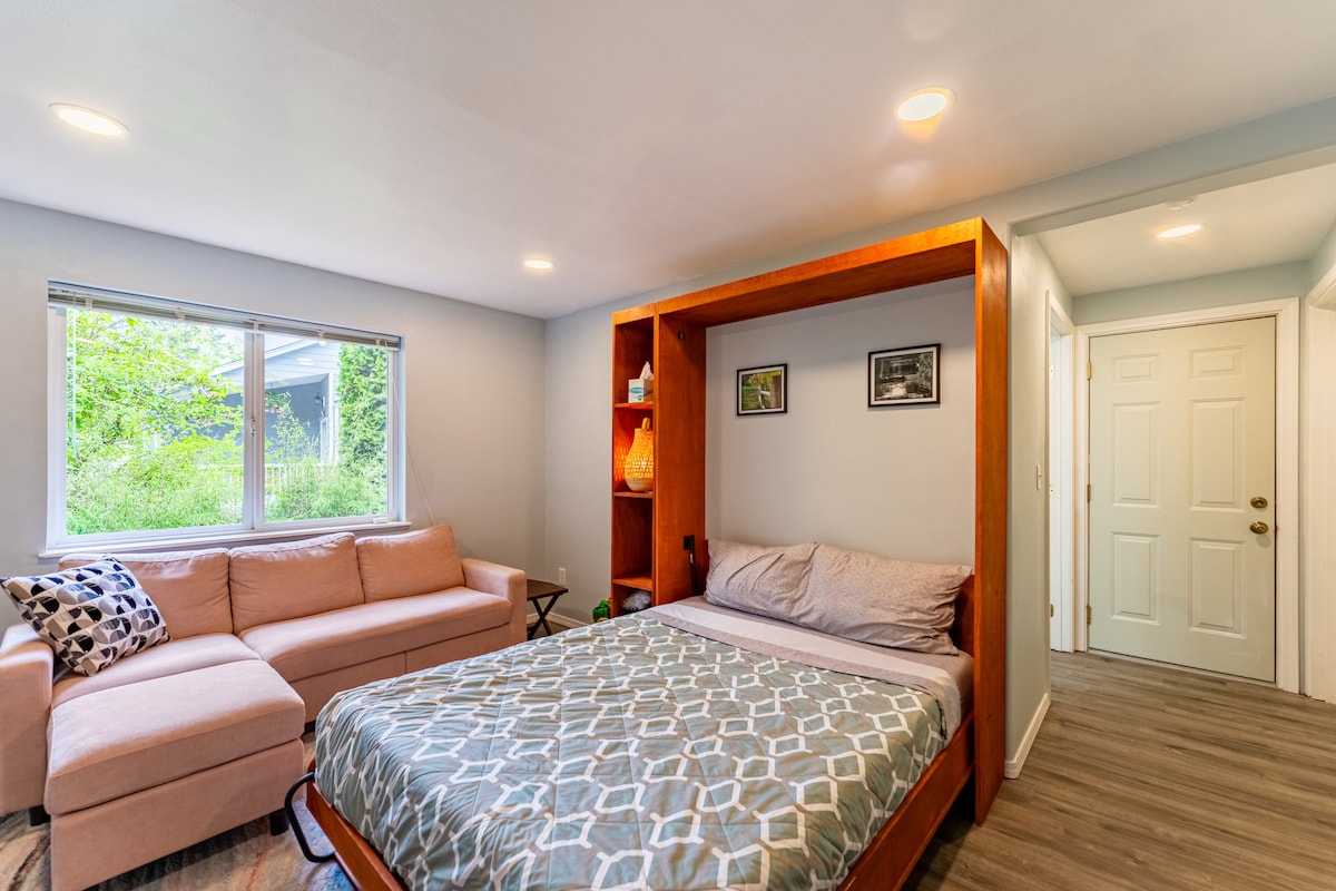 Puni pogled na baštu, svetao i moderno skrovit „gostinjska kuća“ na 5 minuta od autoputa i 10 minuta od trajekta u zapadnom Bremertonu. Prostor je samostalna jedinica odvojena od naše glavne kuće ušuškana pored glavne ulice, smještena među cedrovima i jelima duž zaliva Mud Bay koja se povezuje sa Puget Soundom. Soba ima pogled od 270 stepeni na bašte i drveće, krevet veličine kraljice, frižider, sudoper, mikrotalasnu rernu, šporet na drva i kupatilo, zajedno sa kišnim tušem od 16inča.