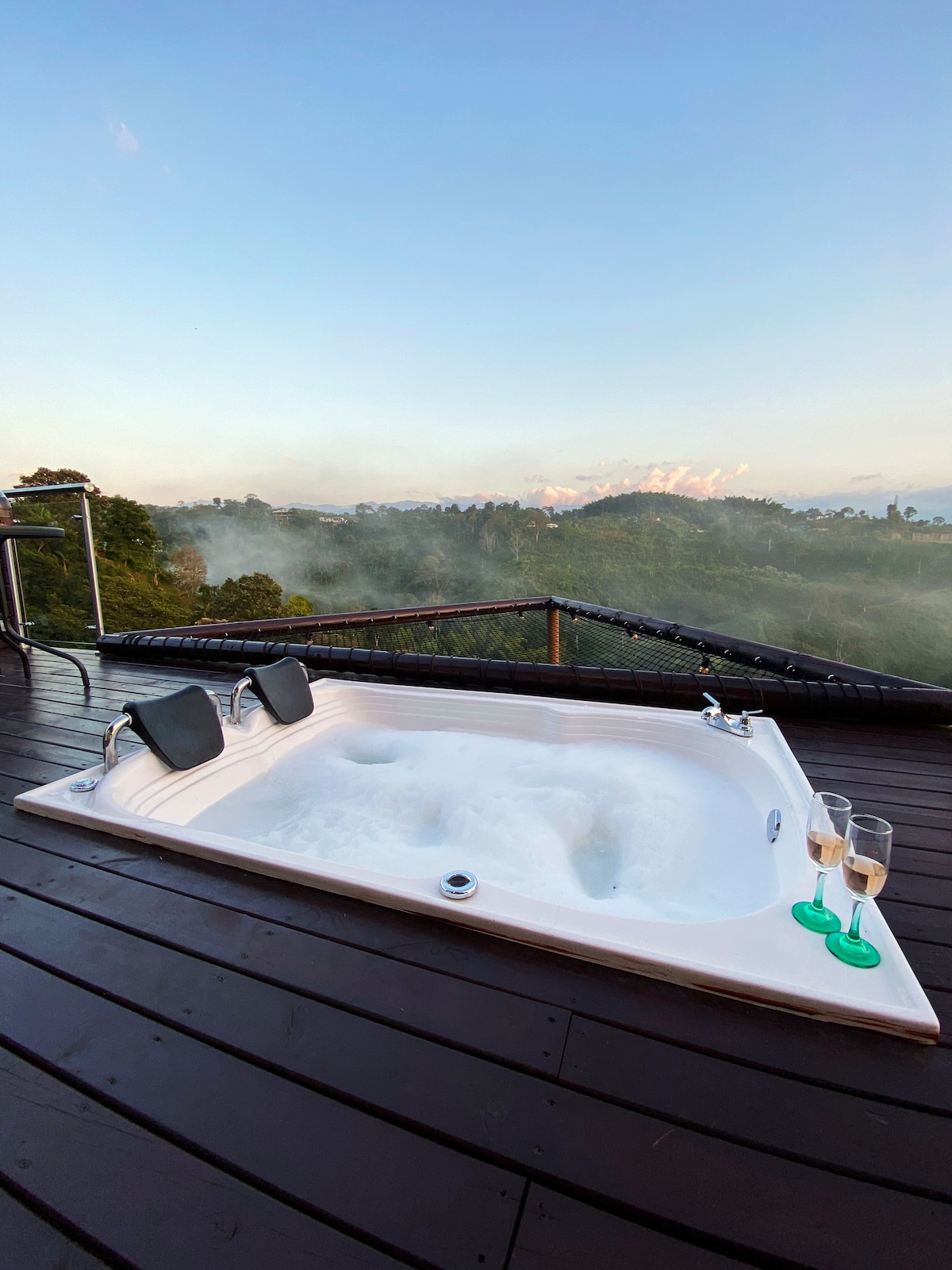 Escápate a una cabaña romántica con jacuzzi privado en el corazón del Quindío Bienvenido a nuestra cabaña privada dentro de una reserva natural, a pocos minutos de Armenia y Salento. Aquí te esperan amaneceres con canto de aves, un jacuzzi al aire libre entre árboles, y noches estrelladas. Lo que ofrece la cabaña: - Jacuzzi privado - Cama doble con sábanas premium - Cocina y barril de asados - Desayuno incluido donde te damos los ingredientes para que lo prepares a tu gusto.