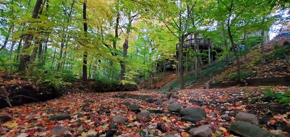 U časopisu Timeout Magazine kao 10 najboljih Airbnb smještaja u Čikagu, a u drugim prodajnim mjestima kao najromantičnijih i 5 najboljih Airbnb smještaja u Viskonsinu, ovaj smještaj ima impresivan doživljaj prirode, s pogledom na potok i šumu sa svim modernim udobnostima. Zamislite da ste u brvnari u šumi da se isključite i napunite baterije, probudite se uz ptice koje cvrkuću kao u kući na drvetu! 3 milje do jezera Mičigen i dwntn. A ako smo kod kuće, besplatan Chai za vas! Dođite, stvorite doživotne uspomene u Racine 's Best Reept Secret!