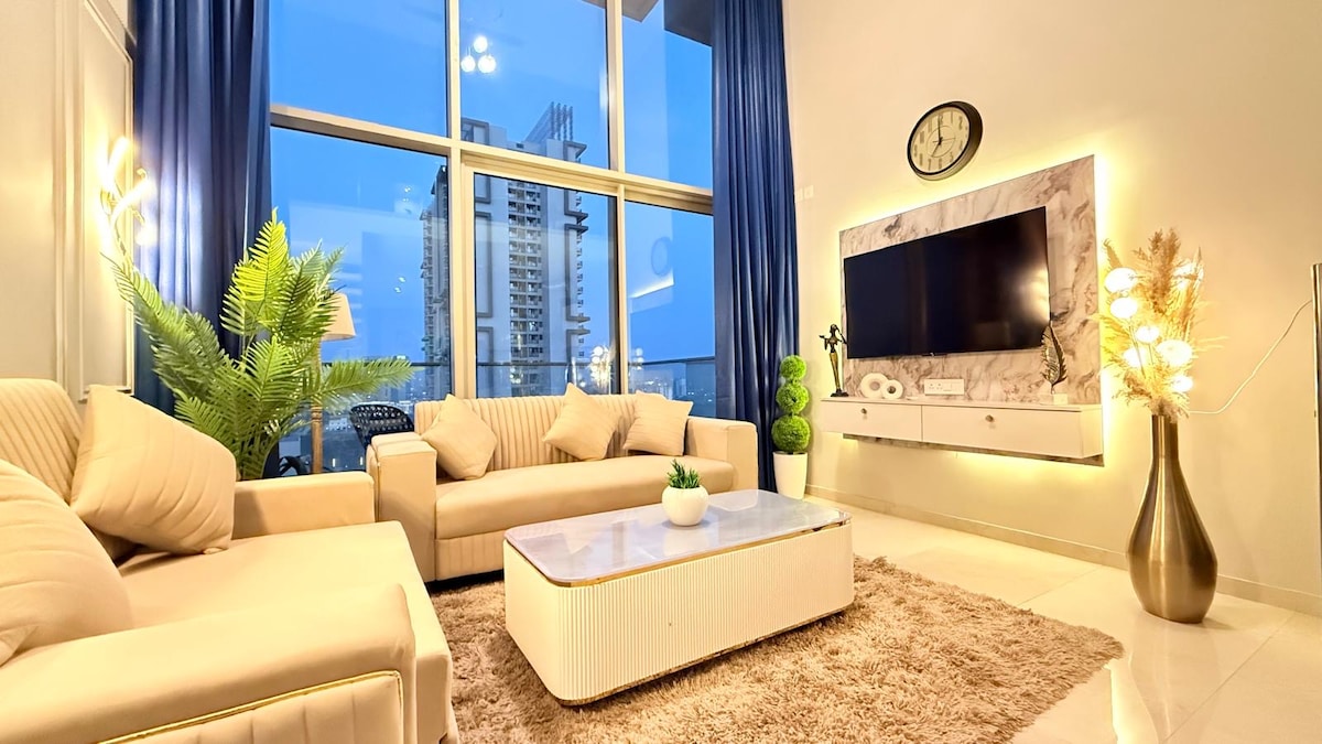 Welcome to Lapstay Gurgaon — where comfort meets style and every stay becomes a memorable experience. Experience modern living in this beautifully designed loft-style duplex apartment located in Sector 74, Gurugram. This two-level luxury suite combines elegant interiors, premium furnishings & thoughtful amenities to ensure a relaxing and enjoyable stay. Large windows allow plenty of natural sunlight to brighten the space, while blackout curtains offer privacy and peaceful rest whenever needed.
