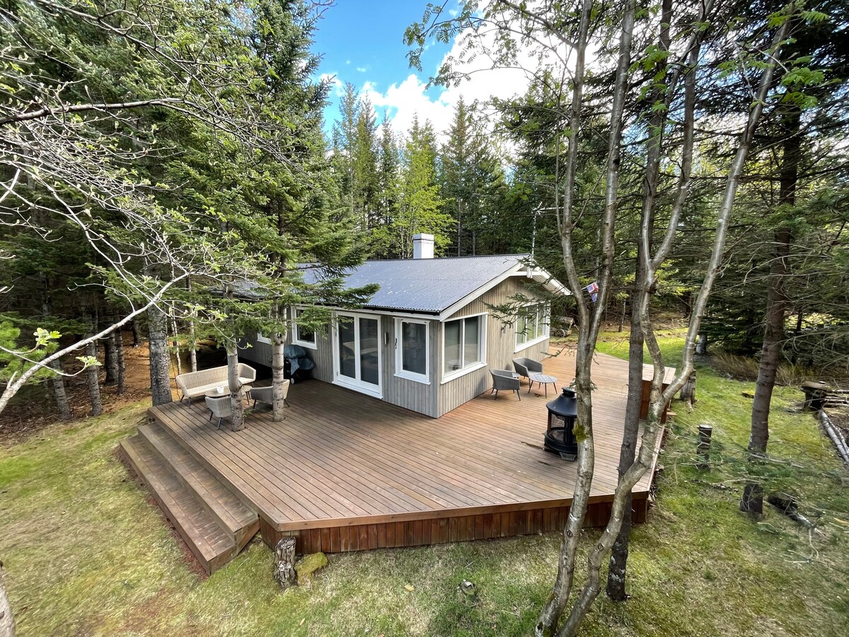 Moderna ljetnja kuća za parove u mirnoj islandskoj prirodi. Opustite se na udobnom bračnom krevetu, uživajte u prozoru veličine cijelog zida, pametnom televizoru, zvučniku i balkonu. Čajna kuhinja sa svim osnovnim potrepštinama. Prostrano kupatilo. Nekoliko koraka od potoka; rijeka je udaljena 60 m. Istražite Zlatni krug, južnu obalu, termalne izvore, vožnju motornih sanki. Gledajte polarne svetlosti od septembra do aprila iz kreveta ili napolju. Savršen romantični odmor.