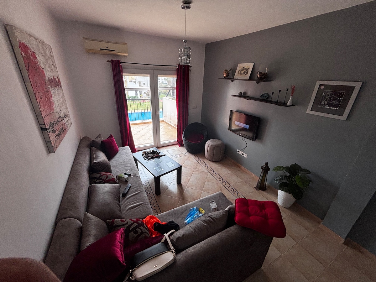 Udoban stan s pogledom na bazen, idealan za porodice Dobro došli u ovaj prelijepi, svijetli i potpuno opremljeni apartman, idealno smješten u ograđenoj, mirnoj i savršeno sigurnoj rezidenciji, rezervisanoj za porodice. - Namještena kuhinja Sa balkona uživajte u neometanom pogledu na bazen, savršen za opuštanje u bilo koje doba dana. Rezidencija nudi mirno okruženje sa danonoćnim obezbjeđenjem, zelenim površinama i prelijepim bazenom dostupnim stanarima.