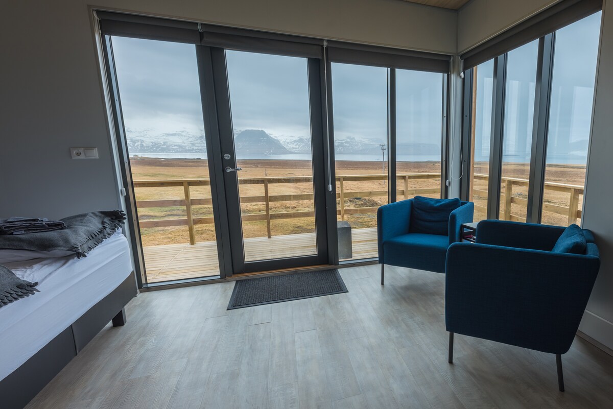 Prekrasna seoska kuća od 37 m2 koja se nalazi u srcu Stikisholmura, s pogledom na zaliv Breiđafjörđur iz dnevne sobe. Savršena lokacija i kratka šetnja do luke, restorana, prodavnice namirnica i zajedničkog bazena. Mala, ali prostrana, koliba je nedavno renovirana, ima drvene podove i geotermalno podno grijanje. Kupatilo sa tušem i privatna spavaća soba za dvije osobe. U potkrovlju iznad mogu da spavaju još 1–2 gosta.