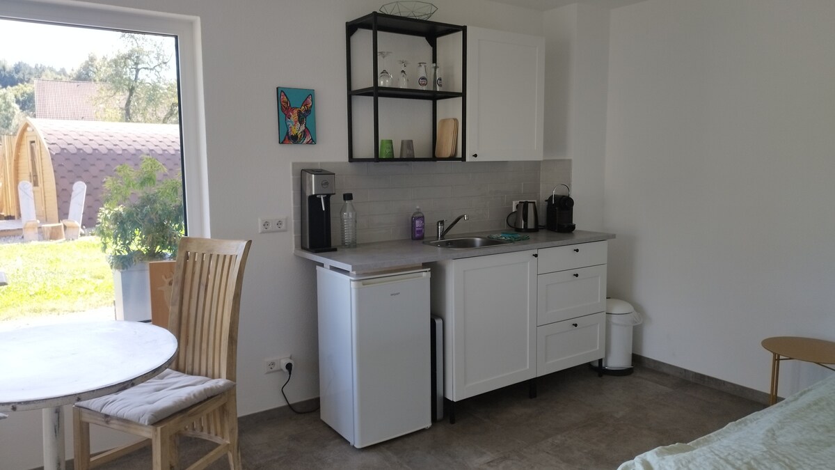 Stan za goste s pogledom na susjedni prostor FFH nalazi se u našoj kući u zasebnom prostoru (zvučno izolovana vrata) sa zasebnim ulazom. Možete da uđete u stan u bilo kom trenutku pomoću koda i zaključate ga pomoću koda. Soba i kupatilo imaju podno grijanje ili hlađenje ljeti. Krevet za bebe (120x60 cm) i stolica za hranjenje su dostupni na zahtjev. Sauna se može rezervisati (25 EUR za termin, oko 3-4 sata uklj. Peškiri za saunu).