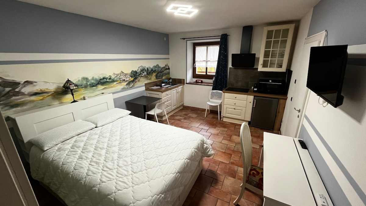 Mini apartman sa balkonom u mirnom i dobro usluženom području, Trento Sud. Na 2 minute hoda nalazi se supermarket, apoteka, trafika, bar, autobus, dječiji park i prostor za pse. Lokacija je idealna za posjetu gradu i u blizini autoputa. Na ulazu se otvara kuhinja u dnevnoj sobi sa led TV-om od 42inča i sofom za 2 osobe Mjesta; spavaća soba ima bračni krevet s ugrađenim ormarom. Kupatilo ima veliki tuš, umivaonik, WC šolju, bide i mašinu za veš. Neograničena WI-FI veza.
