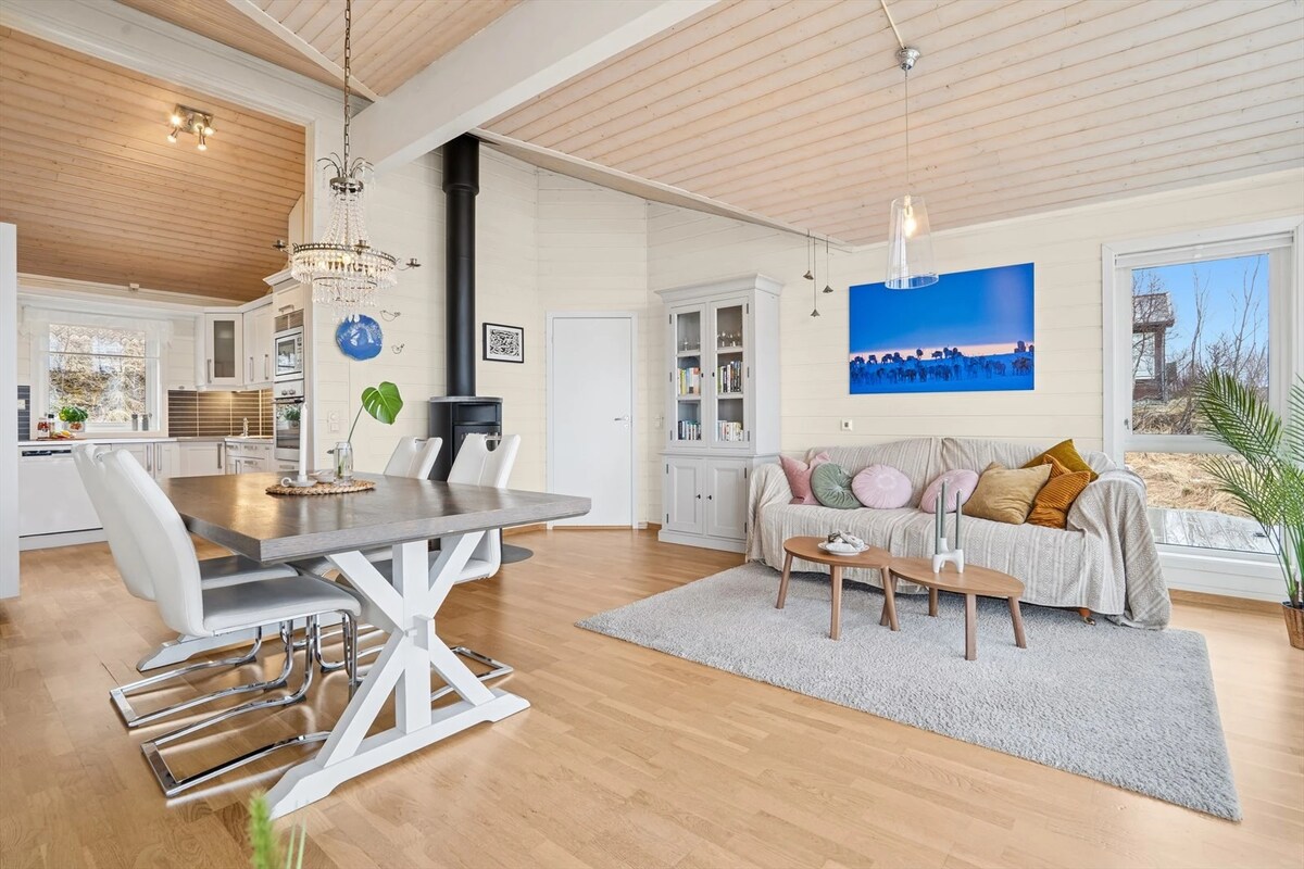 Spektakularna novoizgrađena kuća (2018.) u divnom, mirnom području sa prelijepim pogledom na fjord/more, planine i šumu u Kvaliji /Tromsu. Možete da posmatrate prelijepu sjevernu svjetlost / polarnu svjetlost sa ogromnog prozora (10 m2), sjedeći u dnevnoj sobi sa šoljicom čaja ili kafe u ruci:-) Ovo je savršeno mjesto za turiste koji žele da vide sjeverno svjetlo, kitove u fjordu zimi, planinarenje/ skijanje u planinama ili sve ostalo što želite u ovom divnom gradu.