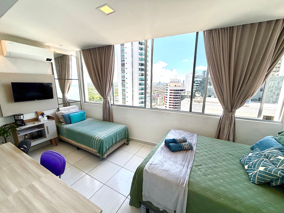 Studio okrenut prema moru, 15 minuta od aerodroma i starog Recife i Kongresnog centra. Stara i tradicionalna zgrada na najpopularnijem i najbezbjednijem mjestu plaže Boa Viagem, sa restoranom Seu Tito, Alphaiate barom i kafićem Borsoi u prizemlju, prodavnicom koja radi non-stop i supermarketom Assaí u blizini. Idealno za praktične i dinamične ljude, sa dobrom unutrašnjom strukturom, kuhinjom, Wi-Fi mrežom, bračnim krevetom, klima-uređajem i dobrim tušem. Treći gost je smješten u udobnom dušeku za kraće boravke.