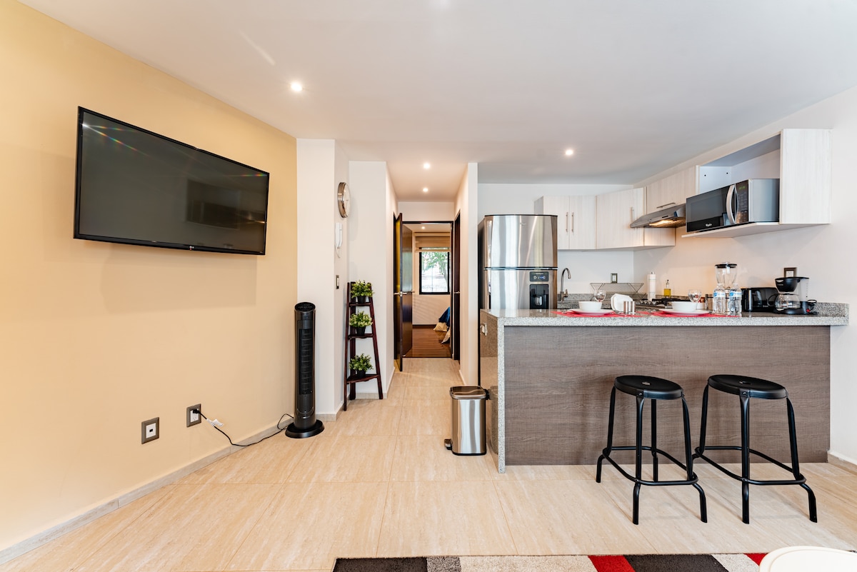 "Mexican traditions", located in a Porfirian building in Roma Norte, decorated with references to Mexican traditions. It has: spacious and equipped bathroom; washing machine strategically located; kitchen equipped with grill, microwave, and refrigerator; dining room with table and chairs for four people; living room with sofa and chairs to relax. Master bedroom with king-size bed, closet, TV and air conditioning. Access to the garden from the living room and bedroom. Ideal for extended stays.