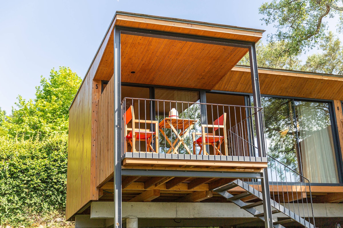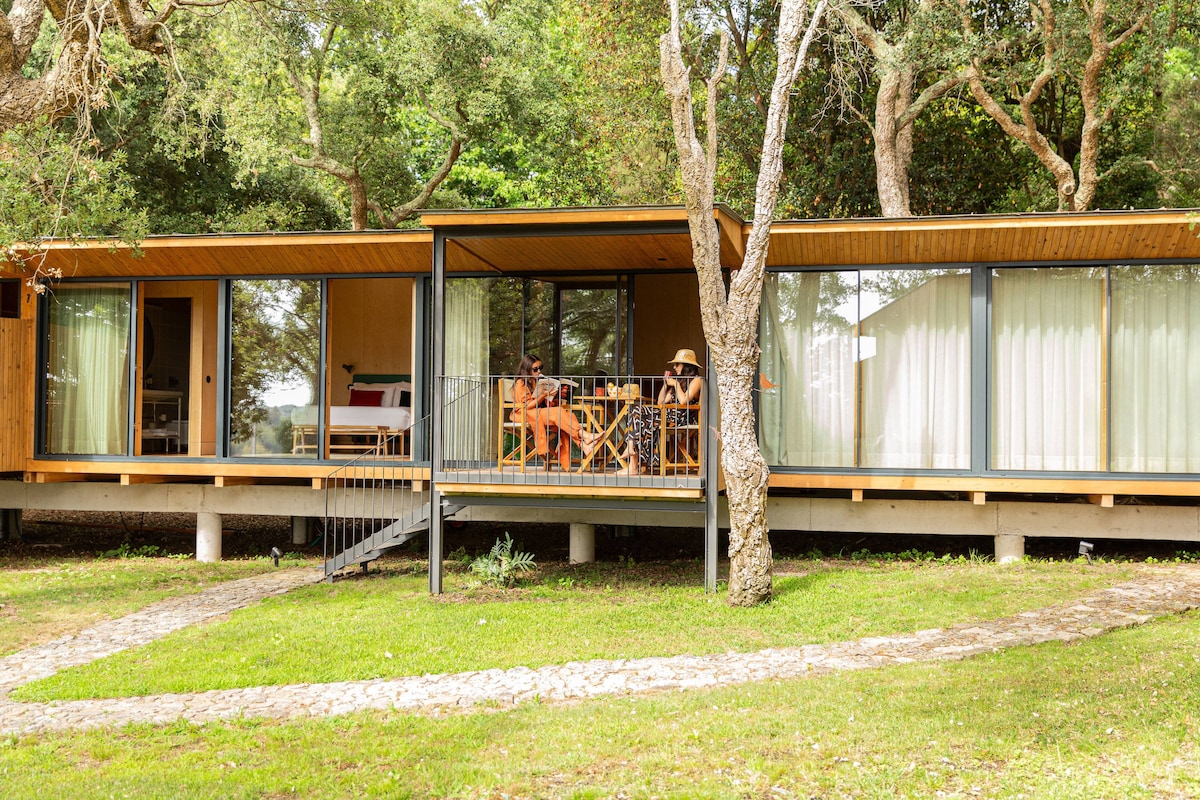Smještaj se sastoji od 4 modula, sa ukupno 9 jedinica (6 T0 i 3 T1). Koliba sa dva kreveta je T0, idealna za 1 ili 2 osobe, sa dva kreveta za jednu osobu i kupatilom. Ima i balkon sa predivnim pogledom na baštu, savršen za čitanje. Gosti mogu da pristupe zajedničkom prostoru za druženje sa višenamjenskom sobom sa stolom, kupatilom i vanjskom terasom sa pogledom na bazen. Kućni ljubimci (pas) su dozvoljeni u izuzetnim slučajevima, uz zahtev i dodatnu naknadu.