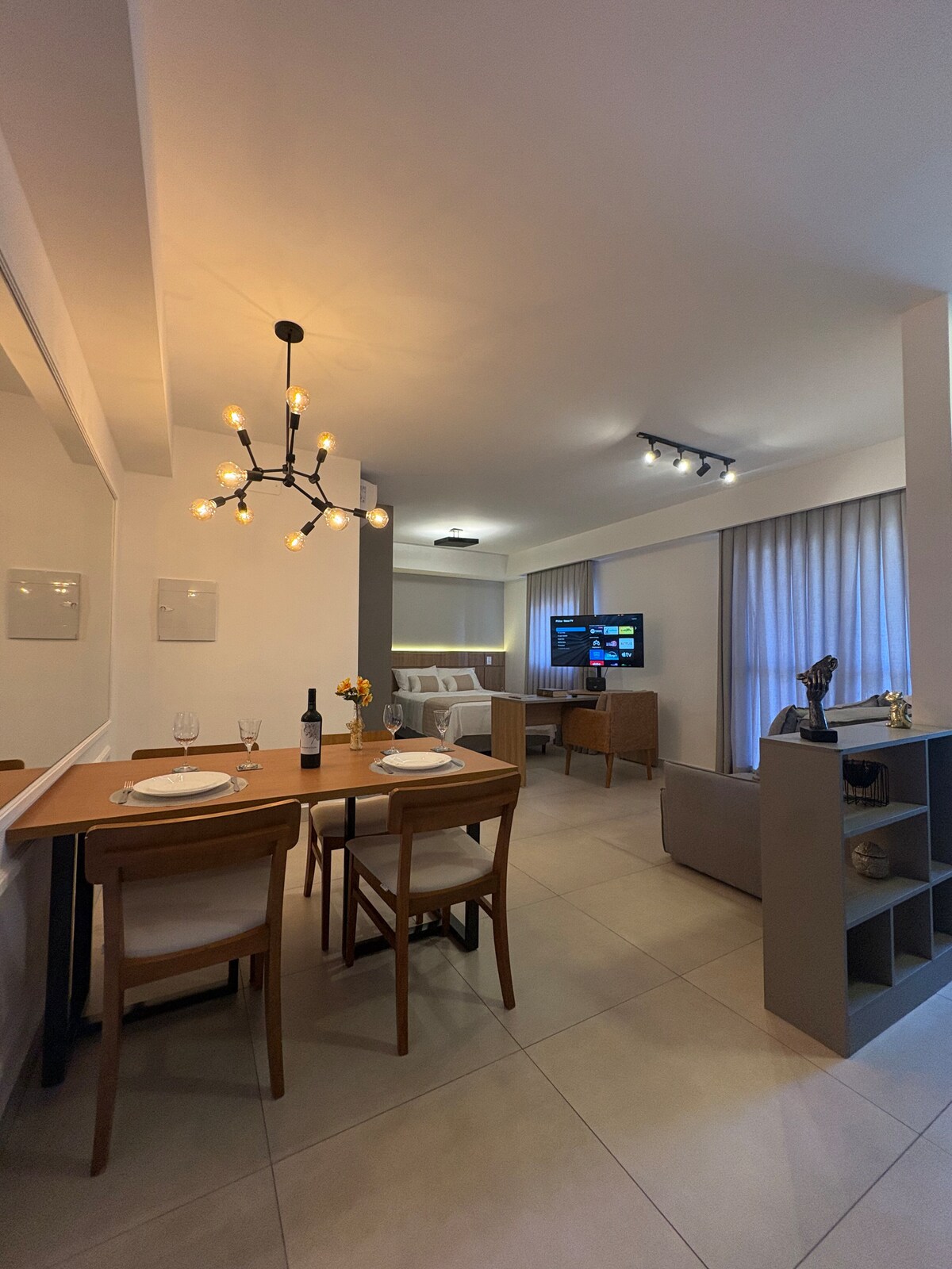Smješteni u plemićkom regionu Ribeiro i u ograđenom kondominijumu, bićete u blizini glavnih sajmova/događaja i 3 minute od prodavnice Ribeirão Shopping. Studio sa elektronskom bravom, mašinom za pranje veša, PAMETNIM okretnim TV-om za 2 okruženja, klima-uređajem, bračnim krevetom sa posteljinom, kaučem na razvlačenje za malo dijete, fen za kosu, Nespresso aparat za kafu, šolje, pribor za jelo, tanjiri, čaše, šolje, indukcioni šporet, električna rerna, igre u loncu i desert. Aceita 1 mali kućni ljubimac