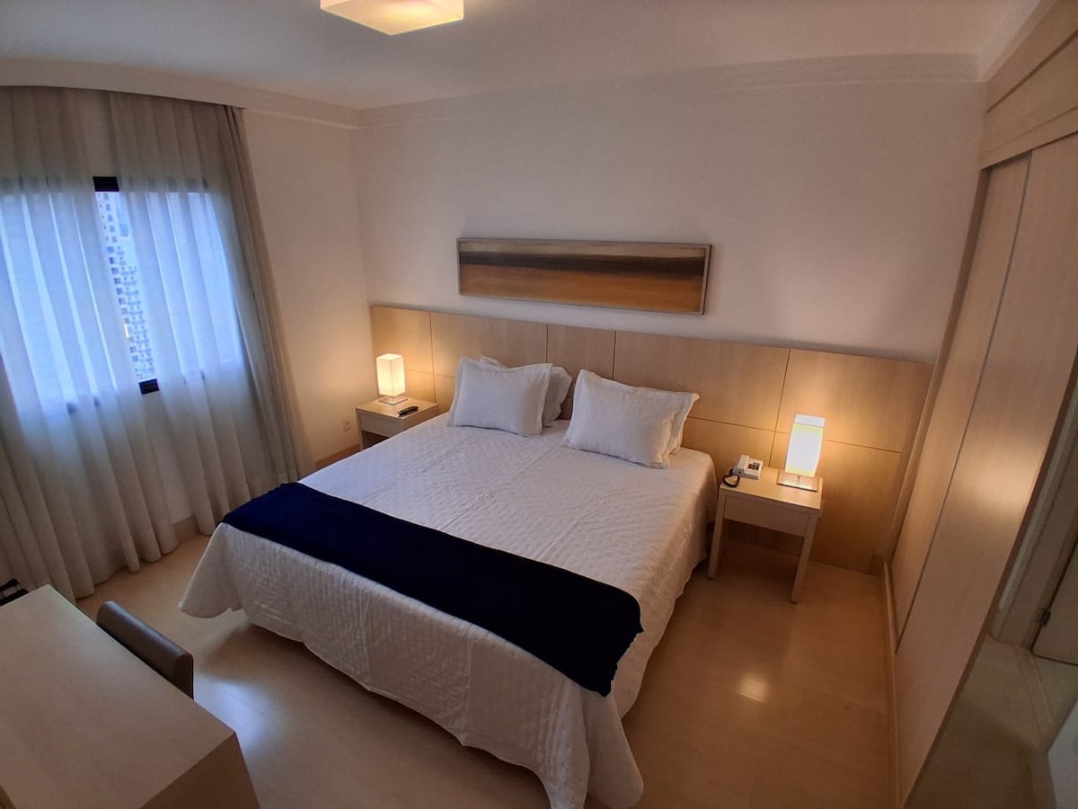 Namješten stan u centru, nalazi se na 12. spratu, sa udobnošću, praktičnošću i odličnom lokacijom. Sadrži 1 spavaću sobu sa bračnim krevetom, 1 kupatilo, dnevnu sobu koja se otvara ka potpuno opremljenoj čajnoj kuhinji, balkon sa pogledom na grad, klima-uređaj u dnevnoj sobi i spavaćoj sobi, TV i Wi-Fi. Sa hotelskom infrastrukturom, bazenom, teretanom, 24-časovnim konsijeržom, liftovima i 1 parking mestom sa uslugom parkiranja. Privilegovana lokacija: na samo nekoliko minuta od tržnih centara Shopping Santa Úrsula i Choperia Pinguim.