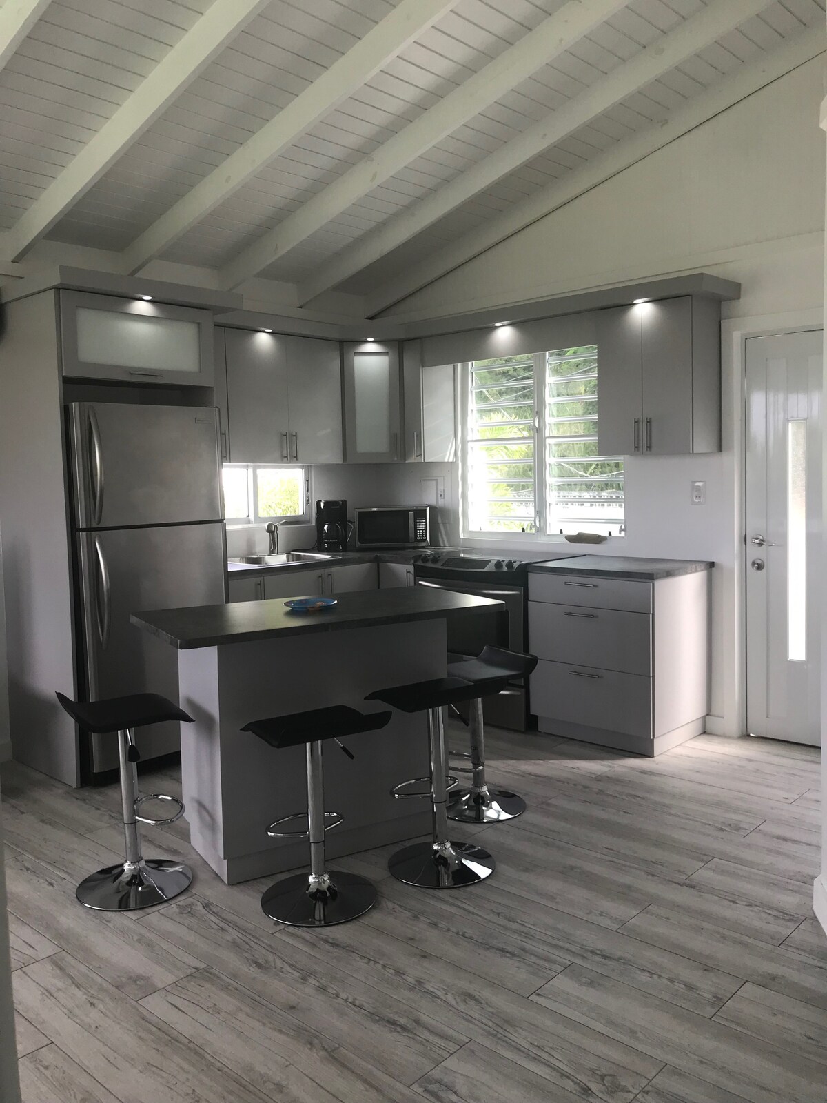 One-year-old minimalist retreat that maximizes on views (inside and out), comfort, privacy, & tranquility. A fully open main floor opens to a salt-water 15 x 18 double-edge infinity pool and pool deck. Solar energy, fully filtered well water, 300 Mbps high-speed wifi, and high efficiency fixtures ensure consistent as possible comfort and connectivity within the fluctuations of island life. Each bedroom has a private balcony and en suite bathroom. Optional studio apt. ($250/night)