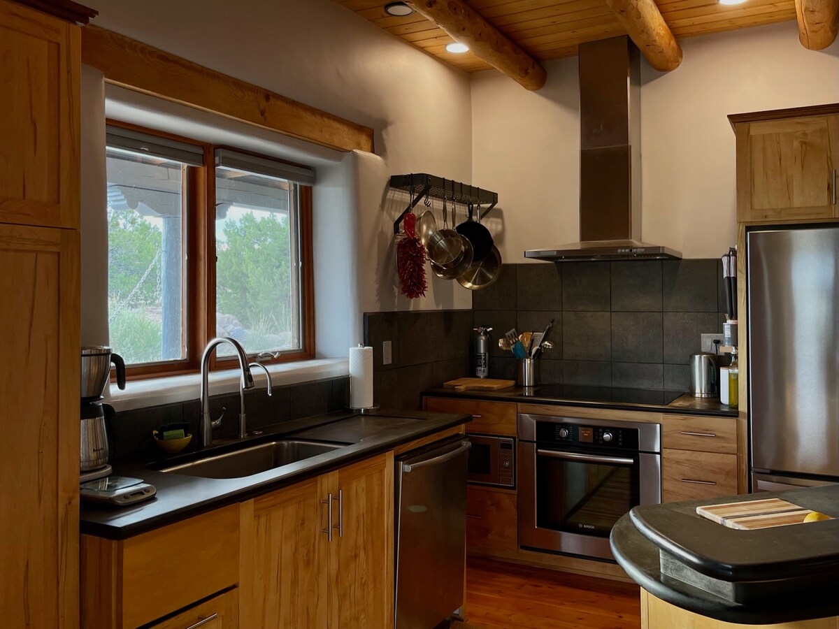 Naša moderna zemaljska kuća je udobno, zanatsko gnezdo koje tretira svoje posetioce svetlom, otvorenim prostorom i bojom. Ima mirno, privatno okruženje sa svime što je potrebno da bi vaš boravak bio udoban i, nadamo se, inspirisan. Na otvorenom je druga polovina ovog doma, stvarajući amfiteatar sa vrtovima, pticama, drvećem i visećom mrežom. Iza ovog privatnog gnezda se pruža pogled od 360 stepeni na planine Sangre de Christo, klisuru Rio Grande, spektakularne zaslone sunca i kilometre pješačkih i biciklističkih staza.