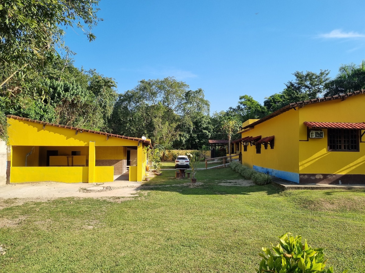 Opustite se sa porodicom u ovom mirnom smještaju u Saquaremi, u ruralnoj četvrti, 15 km od najboljih plaža i vodopada. Ekskluzivno mjesto za nezaboravne trenutke, zajedno sa prirodom, sa svom udobnošću, privatnošću i sigurnošću, u prelijepoj kući sa klima-uređajem, privatnom kuhinjom, kupatilom, pristupom roštilju, zamrzivaču, stonom tenisu, 2 spoljna kupatila, ekskluzivnim i besplatnim parkingom u sklopu objekta. Udaljen je 5 km od centra Bakaksa, 10 km od centra Sakve