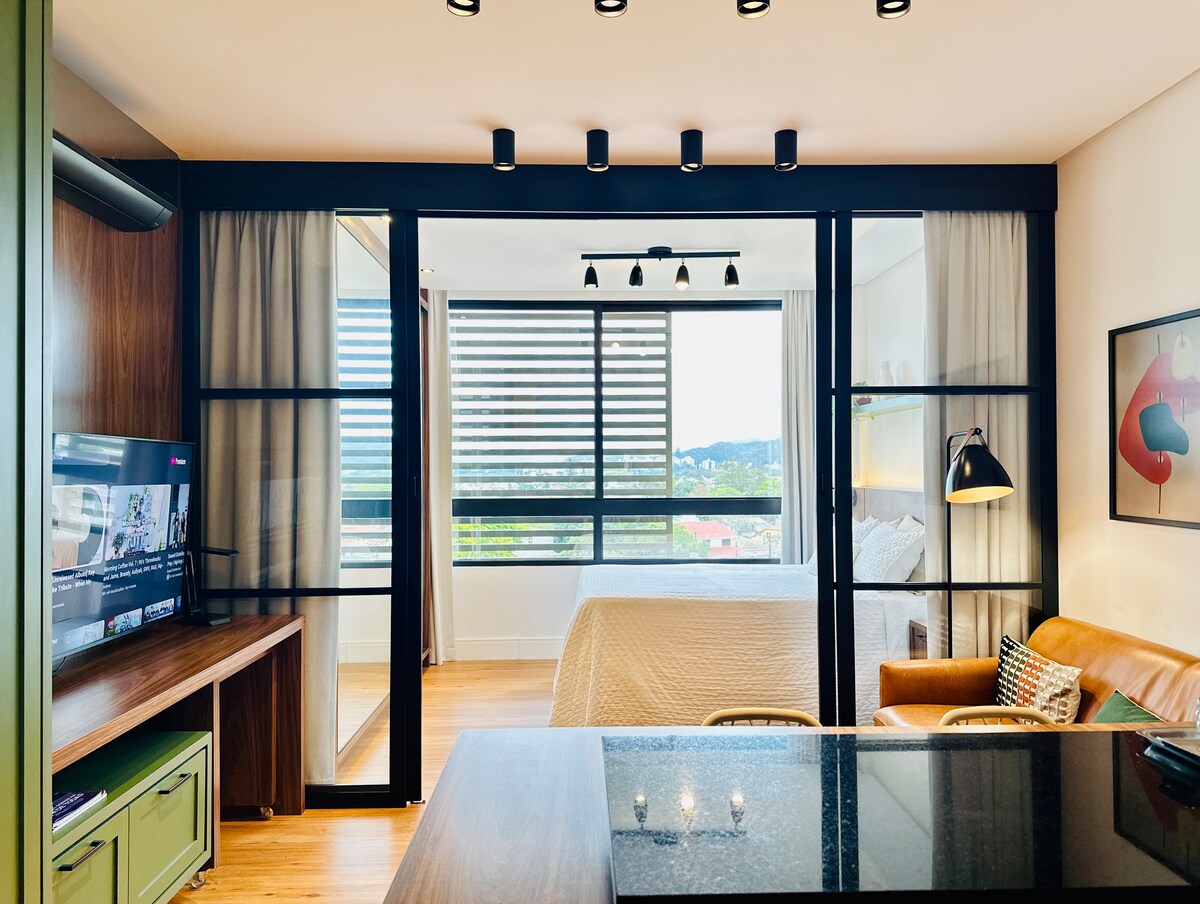 Smješten nekoliko koraka od autobuske stanice Trindade, prodavnice Villa Romana Shopping i u blizini Beira Mar i UFSC-a, ovaj šarmantni prostor okružen je živahnim barovima i zalogajnicama. Veliki prozori pružaju divan pogled na trg, stvarajući živopisnu atmosferu. Idealno za živahne i praktične boravke u Florianopolisu. U kupatilu se nalazi privatna hidromasažna kada za individualnu upotrebu, a izgorjela cementna konstrukcija dodaje industrijski dodir, a indirektna svjetla omogućavaju opuštajuće trenutke.