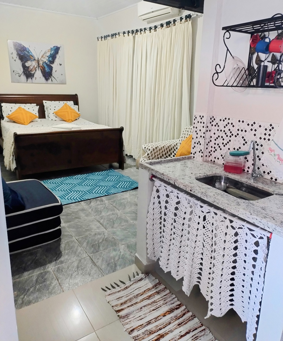 Zaboravite na svoje brige u ovom mirnom i prostranom smještaju. Izuzetno širok Kitnet sa garažom i otvorenim prostorom za roštilj i druženje sa porodicom i prijateljima, prethodna lokacija u blizini Bady Basita i Unimed avenije, samo nekoliko minuta od koledža Famerp i centra grada. Smještaj ima klima-uređaj,TV ski, roštilj, kuhinju opremljenu ultensilijima i uređaje kao što su blender, aparat za kafu i električni tiganj za pirinač i klima-uređaj.