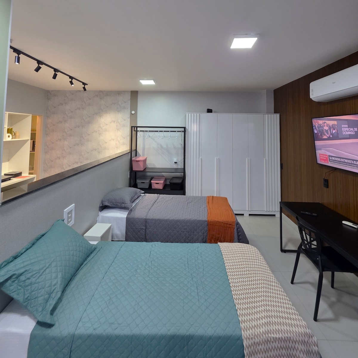 Studio moderno de 30 m², próximo à Faculdade de Medicina de Rio Verde. Ideal para trabalho, estudo ou consultas médicas. Possui 3 camas de solteiro (ou 1 cama king + 1 solteiro), ar-condicionado, Smart TV 55", Wi-Fi rápido e mesa de trabalho. Cozinha completa com geladeira, micro-ondas, Air Fryer e cafeteira. Varanda com cadeiras para descanso. Self Check-in com senha. Bairro tranquilo e seguro, com vigilância noturna. Lavanderia 24h, restaurantes e ponto de ônibus a 1 quadra.