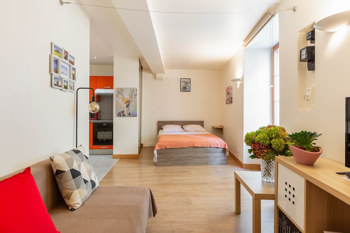 Appt F1 de 26m au 1er étage d'un petit immeuble calme, dans le centre historique de Riom; possibilité de se garer facilement à 50m. Entièrement refait à neuf, composé d'un couloir d’entrée, d'une salle d'eau, d’un séjour canapé (convertible en lit 2 places)/table/coin TV, d’un espace nuit avec lit 140cm + placard et cuisine entièrement équipée (frigo-congélateur, four multi-fonctions, micro-ondes, plaque de cuisson vitro-céramique, hotte, vaisselle, cafetières, table à manger pour 3 personnes).