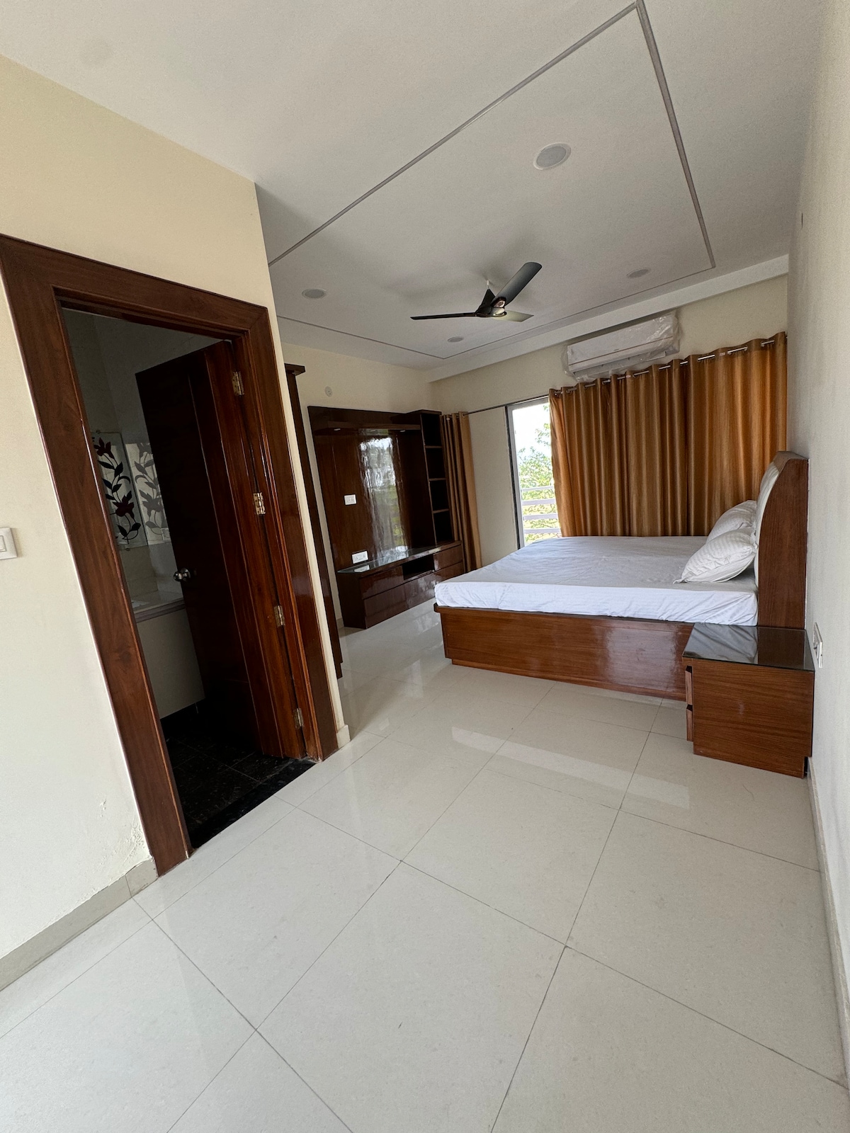 Apartman sa velikim bračnim krevetom – panoramski pogled na planine i šumu Smješten u jednom od najslikovitijih kutaka na vrhu brda u Rišikešu, apartman tipa „King“ nudi predivan pogled na bujne šume, otvorene planinske lance i spokojni hram Butnat. Apartman je uređen tako da ima mnogo prirodnog svjetla i u zemljanim tonovima, a ima i luksuzan bračni krevet (širine 180–220 cm), privatnu čajnu kuhinju i prelijepo uređeno kupatilo s tušem s efektom kiše. Svaki detalj – od nameštaja do završnih obrada – ručno je izrađen na licu mesta
