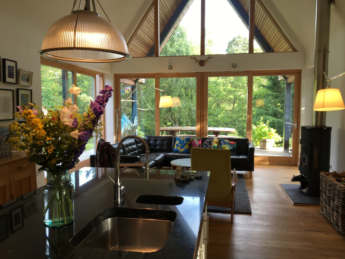 Šarmantna udobna brvnara za mirno utočište sa lepim pogledom, savršena za opuštanje nakon jednodnevnog istraživanja! Idealno za šetnju uzbrdo, biciklizam, ribolov i mnoštvo drugih aktivnosti. 3 milje od popularnog sela za mesta za jelo i piće, 15 milja od prestonice Hajlend. Vaši domaćini Martin i Ema imaju 8-godišnje blizance i 2 ljubazna psa. Brvnara ima mnogo sadržaja za vašu udobnost, uključujući ringlu, potpuno opremljenu kuhinju i tuš kabinu.
