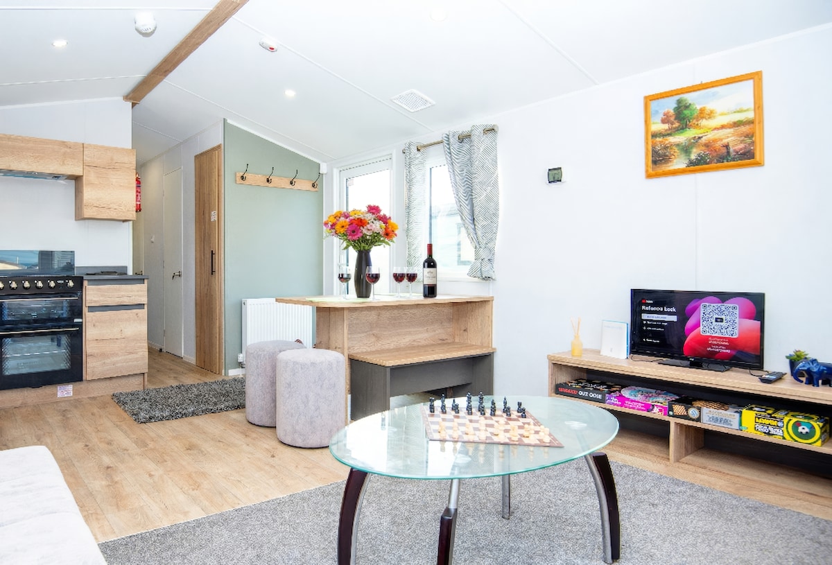 Novouređena statična kamp prikolica sa neometanim pogledom na more. Nema boljeg mjesta za posmatranje izlaska sunca tokom ljeta. Pristup svim objektima odmarališta Parkdean, uključujući restoran, klupsku kuću i bazen, kupovinom propusnice sa recepcije. Za 6 osoba: 1 bračni krevet, 2 kreveta za jednu osobu, 1 krevet na izvlačenje u dnevnoj sobi. Prikladno za pse, ali pušenje nije dozvoljeno. TV u dnevnoj sobi i dvokrevetna soba. Čajnik, mikrotalasna rerna, toster, aparat za kafu. Pegla i daska.