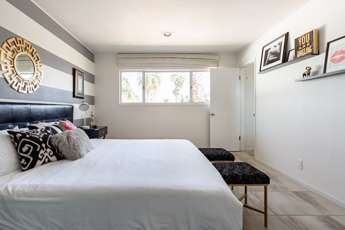 Na ovom laganom odmoru u srcu čuvene četvrti Movie Colony, atmosfera Palm Springsa je udaljena manje od 1 milje od centra grada. Uronite u bazen s morskom vodom i isperite ga na otvorenom prije nego što se smjestite pored kamina ispod dlanova. Unutrašnjost, odvažne boje i bogate teksture donose toplinu u svaku prostoriju, dok udoban otvoreni raspored čine ovo udobnim mjestom za grupe svih veličina. Kratka šetnja do prodavnica, restorana i Kongresnog centra u centru grada.