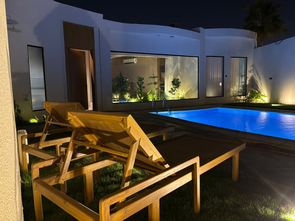 Luksuzna gostinjska kuća za dnevni najam u okrugu Al Malka u Rijadu. Sa površinom od 600 kvadratnih metara, sastoji se od velike sale, dvije spavaće sobe, spoljašnje prostorije za sunčanje, bazena od 7 x 4 metra (koji može biti pokriven zbog bezbjednosti), male kuhinje, prostora za sjedenje na otvorenom na zelenom travnjaku i roštilja na plin. Može da primi najviše 4 osobe za boravak i spavanje ili okupljanje uz ručak/večeru za otprilike 10 osoba. (Poželjno je da djeca nijesu dozvoljena).
