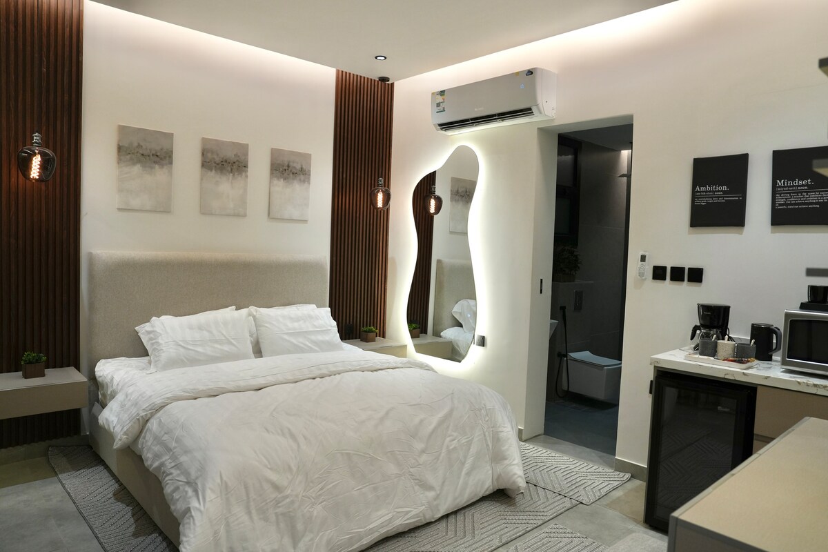 Elegantan studio u okrugu Al Aqiq, potpuno opremljen svim sadržajima, sa pametnim ulazom i vrhunskom lokacijom sa jednostavnim pristupom ključnim destinacijama Rijada. 8 minuta od Bulevara 8 minuta od zvijeri 7 minuta od KAFD-a 18 minuta od aerodroma 6 minuta od Univerziteta King Saud Dostupan je neograničen brzi internet od 5 G Ekran od 70 inča