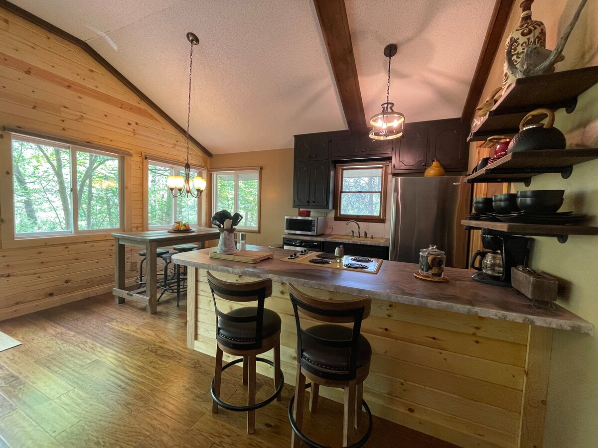 Nalazi se na jezeru Biver sa zadivljujućim pogledom na vodu i mnoštvom sadržaja. Privucite se uz udoban kamin. Opustite se u đakuziju uz svijeće za dvoje (ne u hidromasažnoj kadi) s pogledom na prelijepi krajolik planina Ozark. Odspavajte da spavate u bračnom krevetu veličine kreveta za spavanje dok posmatrate zvijezde i vrhove drveća kroz stakleni zabat. Uživajte na terasi sa roštiljem na gas i kompletnom kuhinjom koja je u potpunosti opremljena priborom i potrepštinama. Naknada za kućne ljubimce: 50 $ - prvi pas; 25 $ - svaki dodatni. Najviše 2.