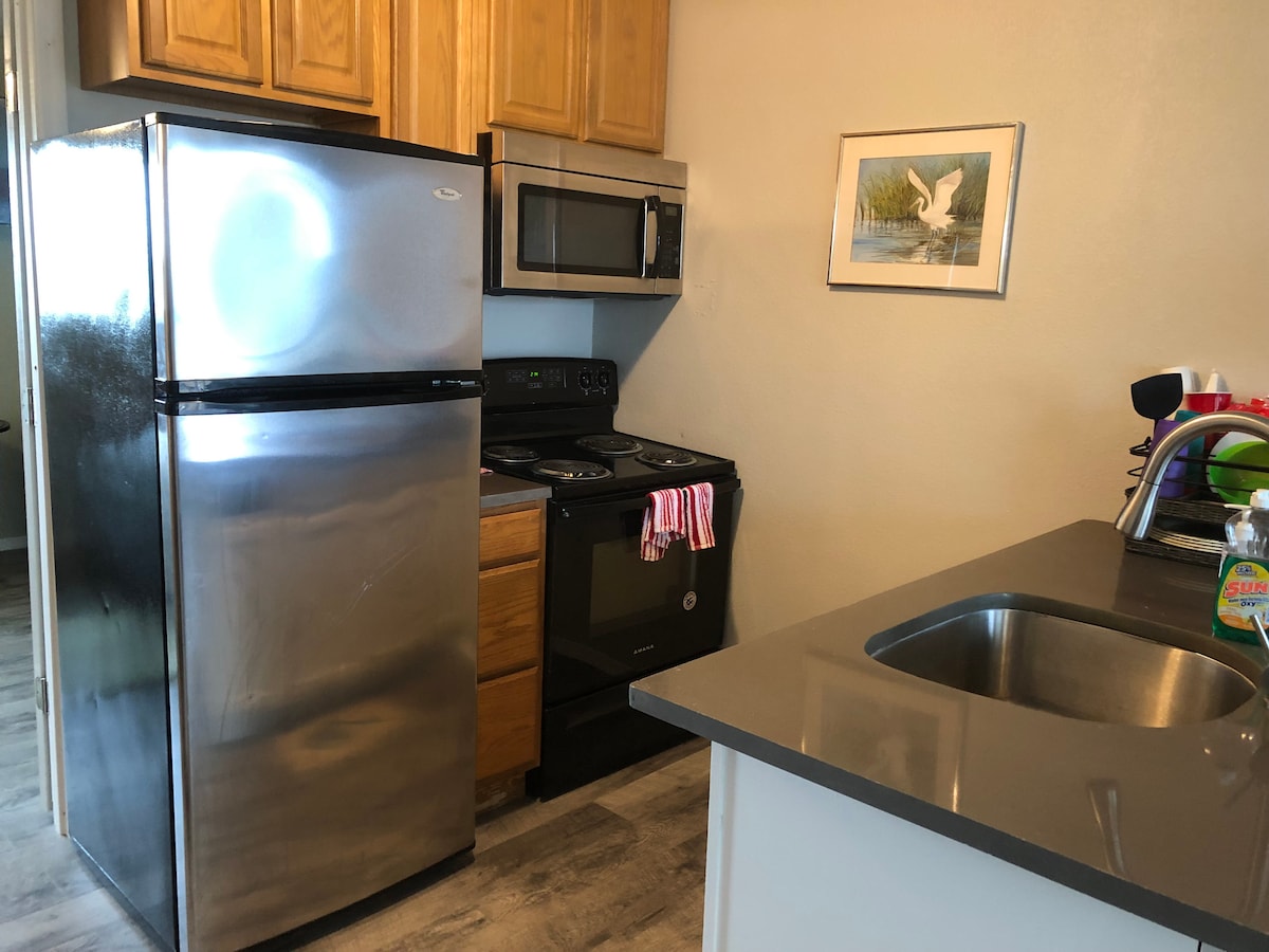 Osvježeno 650 kvadratnih stopa Seoska kuća s 1 spavaćom sobom i 1 kupatilom, s privatnim bočnim ulazom, u mirnom, uređenom kraju. Uživajte u udobnom bračnom krevetu, potpuno opremljenoj kuhinji, brzoj Wi-Fi mreži i usluzi striminga Roku + Fire Stick. Savršeno za opuštajuće boravke, poslovna putovanja ili vikend-putovanja. Prikladno za pse (najviše 2, bez drugih kućnih ljubimaca). Parking je samo na ulici. 15 minuta do pristaništa Bob Hol, ostrva Vajtkep i Mustang, 10 minuta do Teksas State Akvarijuma i USS Leksingtona, 40 km do Port Aransasa. Imajte na umu da je u oblasti bkyd suša 5. stepena i da nije tako zeleno. ID dozvole: 001632.
