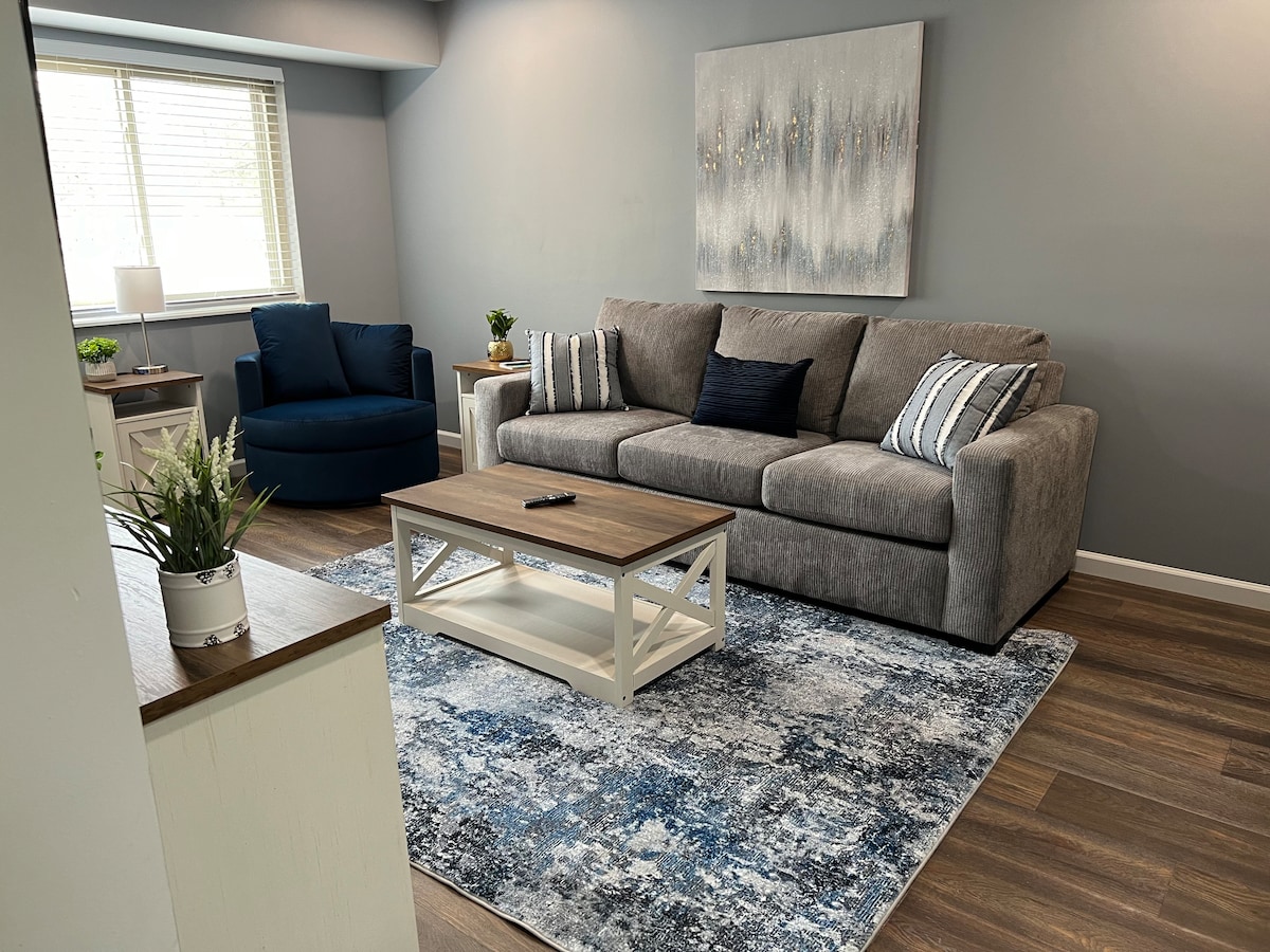 Kreirali smo moderan prostor za doček gostiju. 2 BR apartmana pored reke Detroit i parka Navy Yard prekoputa. Smatrajte ga svojim domom van svog doma! Naći ćete mirno mjesto ukrašeno fotografijama koje slave bogatu istoriju Amherstburga! Nalazi se u centru Amherstburga, sa restoranom u nastavku. Kratka ste šetnja do mnogih lokalnih atrakcija u gradu i 20 minuta vožnje do Vindzora ili Detroita!