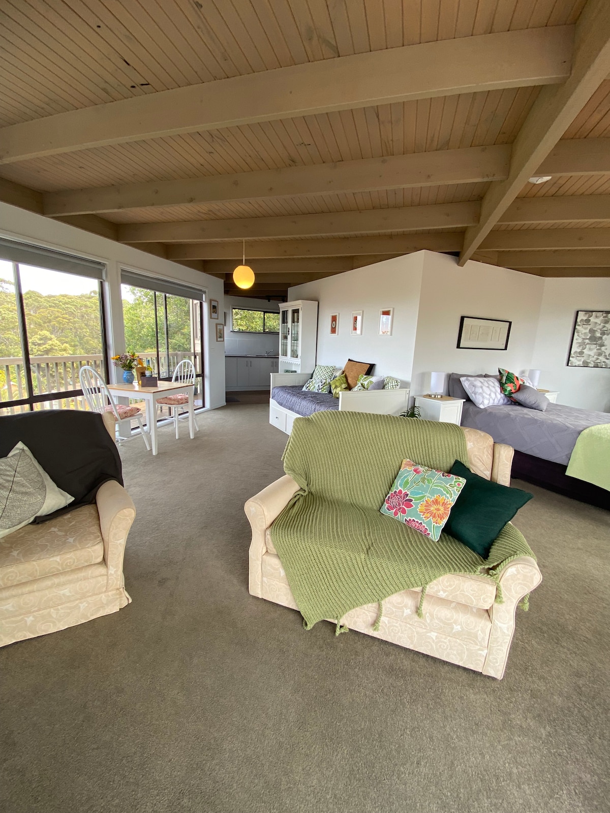 Naše mesto je blizu plaže sa izuzetnim pogledom. Svideće vam se naš jedinstveni način života, sirovi, organski životni prostori, hemijski besplatan život sa „besplatnim“ čistim okeanskim vazduhom. Samo je kratka šetnja do plaža odličnih za one koji traže prostor za zdravlje i velnes. Ovo je samostalna garsonjera koja se nalazi pored našeg doma - čajna kuhinja ne uključuje rernu ili šporet, međutim, tu je i Weber roštilj za bebe, toster, mikrotalasna rerna, frižider i aparat za sendviče. Nudimo besplatan Wi-Fi i Netflix.