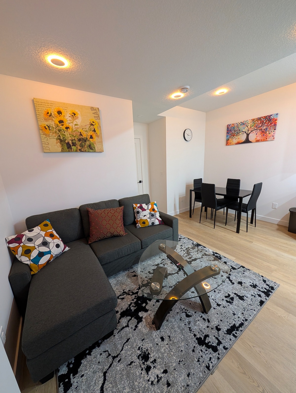 About this space This beautiful 1 bed and 1 den apartment is your home away from home. It offers all the convenience and comfort you need to make your trip memorable and comfortable Modern living space with floor to ceiling window that lets in plentiful and beautiful natural light, and offers amazing views of Downtown Calgary and Rocky Mountains in the distance Unbeatable location offers exceptional convenience to amenities and entertainment experiences. It's close to all public transportations.