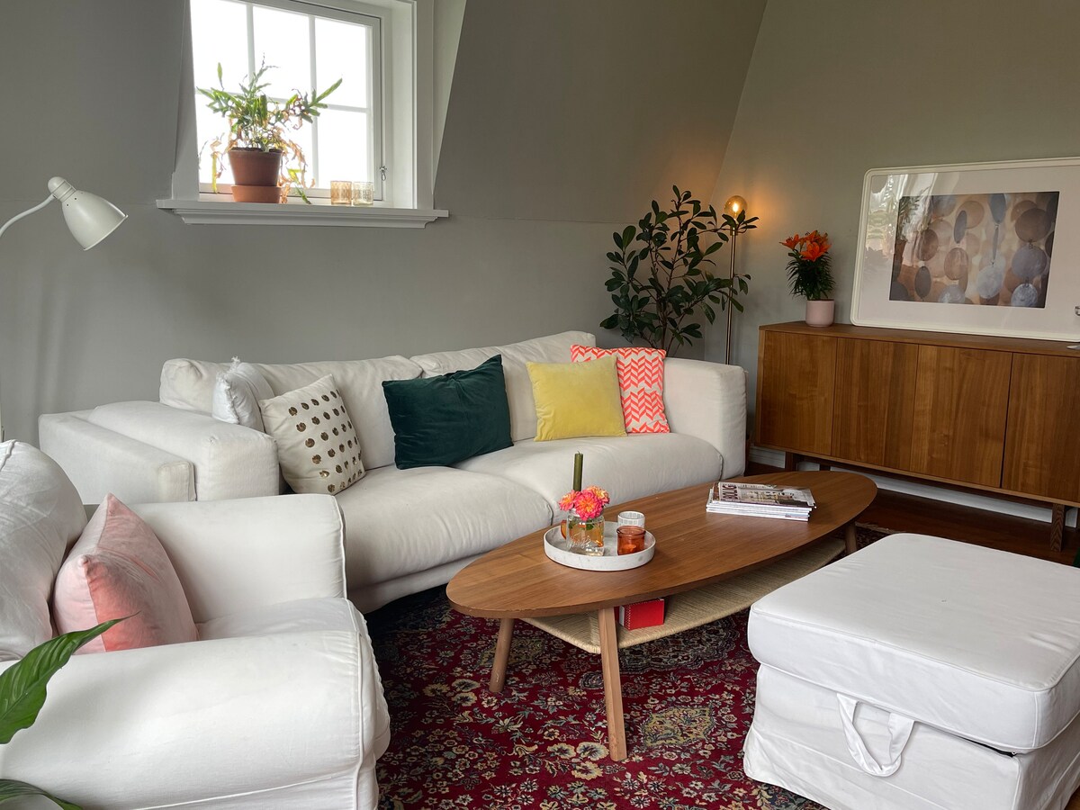 Divan dvospratni stan sa pogledom na kanal (Karmsundet) sa privatnog balkona spolja. Nalazi se u mirnom komšiluku, na pješačkoj udaljenosti od centra grada Haugesunda. Stan je nedavno ažuriran mirnim zelenim bojama i originalnim retro nameštajem. Postavljeni su novi pametni TV od 50inča (Wi-Fi je uključen), nova mašina za pranje veša i mašina za sušenje veša. Dobro opremljen mašinom za sudove, mikrotalasnom rernom i mašinom za sušenje cipela. Ovdje ćete pronaći svoj mir.