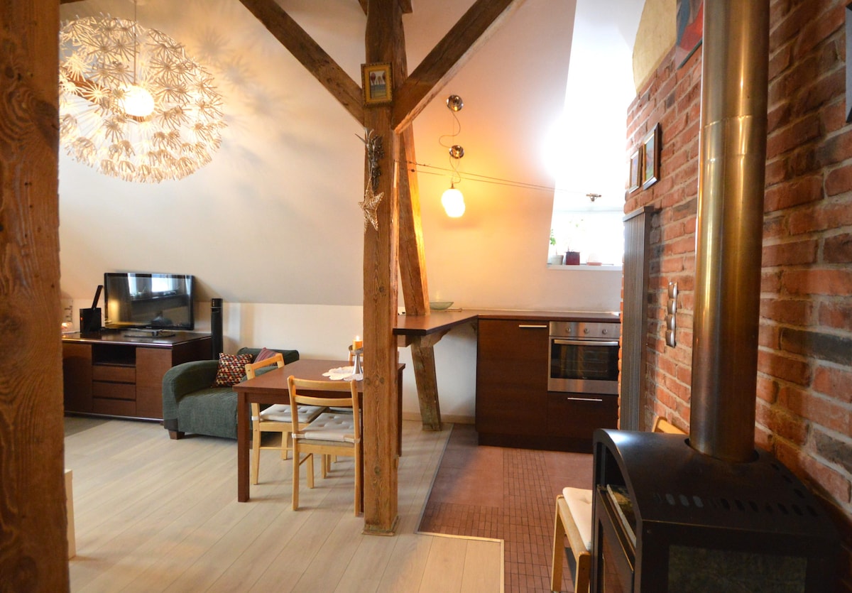 Jedinstveni stan sa kaminom u potkrovlju. Ovaj smještaj smo kreirali samo za sebe, prvobitno sa slikama, knjigama, kolekcijom kaktusa i ručno izrađenom keramikom. Pobrinuli smo se za udobnost – 2 fotelje i kauč, kamin i mnogo jastuka. Tu su i opremljena kuhinja, sto sa 4 stolice, radni sto i brzi optički internet. U blizini se nalazi picerija, bar, prodavnice, 5 minuta hoda do stanice Gdanjsk Oliva.