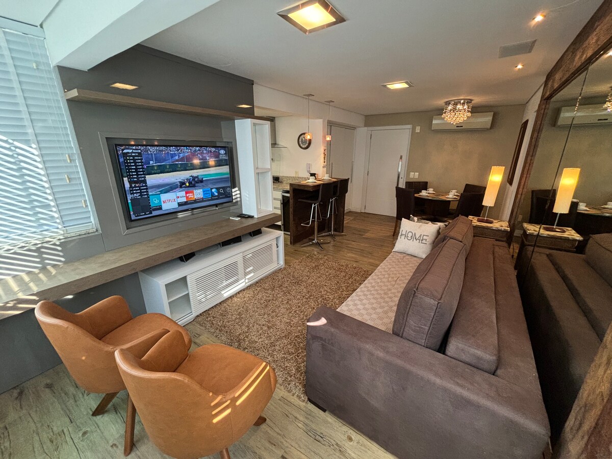 @apaconchego101 Apartment aconchego 101, is in the center of Gramado, close to the covered street, with cafes, shops, pharmacies and restaurants. Pored lijepo uređenog, nudi: 2 spavaće sobe, klima-uređaj, kupatilo za druženje i garažu koja radi non-stop, radi sve pješke, 100% namještena, može da primi do 6 osoba. Internet, televizori su pametni u svim okruženjima. Idealan balkon za vino. Živite najbolje od travnjaka bez izlaska iz automobila sa prilaza, doživite iskustvo života na toplom mjestu.
