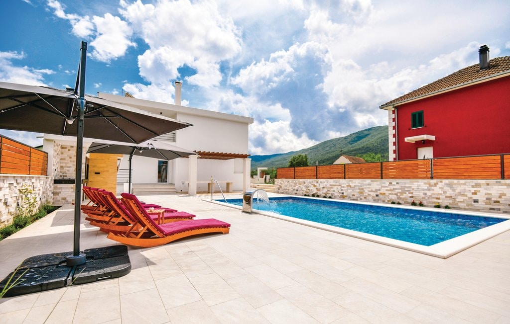 Ova prostrana i moderna vila za odmor nalazi se na ograđenoj parceli u malom selu na dalmatinskim brdima i idealna je za ugodan porodični odmor. Sastoji se od prizemlja i prvog sprata međusobno povezanih unutrašnjim stepenicama. Ispred kuće se nalazi terasa sa letnjom kuhinjom i roštiljem gde možete da pripremite sopstvene specijalitete. Možete da potražite tople letnje dane u bazenu dok možete da skratite vreme u prizemlju wirpoola.