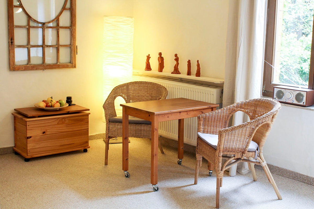 U dvorištu naše secesijske kuće u nizu, pripremili smo ovaj mali smještaj za vas. Kroz veliki ulaz u glavnu kuću, možete da pristupite dvorištu sa seoskom kućom koju koristite samo vi. Na raspolaganju vam je i vrlo malo kupatilo i mali objekat za kuvanje sa frižiderom. Terasa se, na primjer, ljeti može koristiti za doručak na suncu.