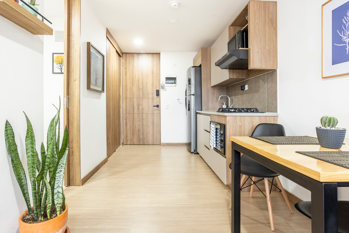 Modern top-floor studio in Laureles with mountain views and private balcony. 5-min walk to top dining & nightlife in Laureles. Features 1.5 baths, fast fiber WiFi, full kitchen, A/C, washer/dryer combo, Smart TV, with private + guest parking. Relax in a quiet, secure building with 24/7 security. Ideal for longer stays, digital nomads, and guests seeking comfort, space, and prime location. Please confirm your travel dates before booking. We prepare the apartment specifically for confirmed stays.